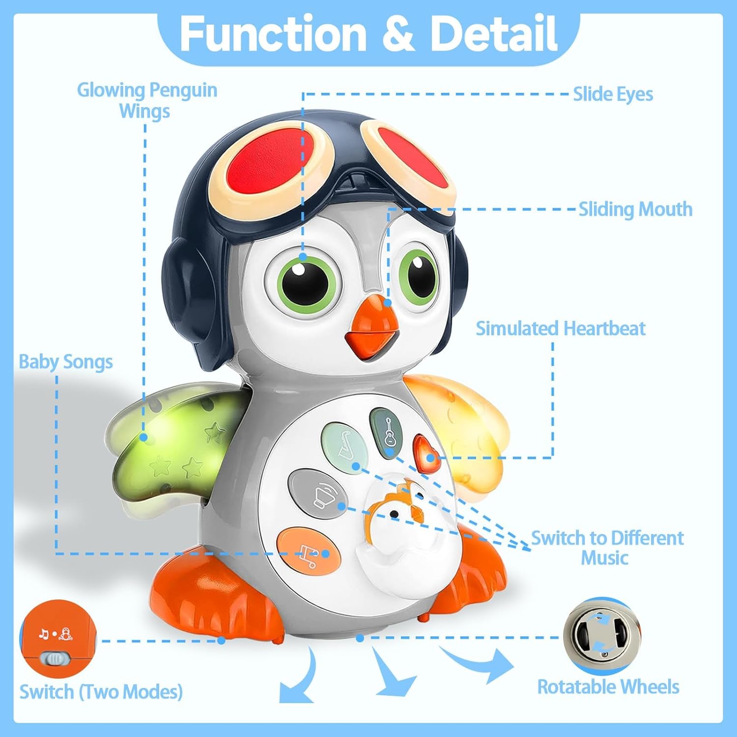 【وضعان للعب】تتميز ألعاب الأطفال من زيسين بطريقتين للعب (وضع الموسيقى النقي ووضع الموسيقى الزاحفة). في وضع الموسيقى النقية، يمكن للأطفال استخدام الأزرار لتبديل الموسيقى، والتي ستكون نجاحًا كبيرًا مع لعبة الموسيقى. بالتبديل إلى وضع الموسيقى الزاحف، سيبدأ البطريق اللطيف في التحرك جنبًا إلى جنب مع الموسيقى، سيتحرك منقاره وأجنحته وعينيه وستكون لعبة تفاعلية فريدة من نوعها..