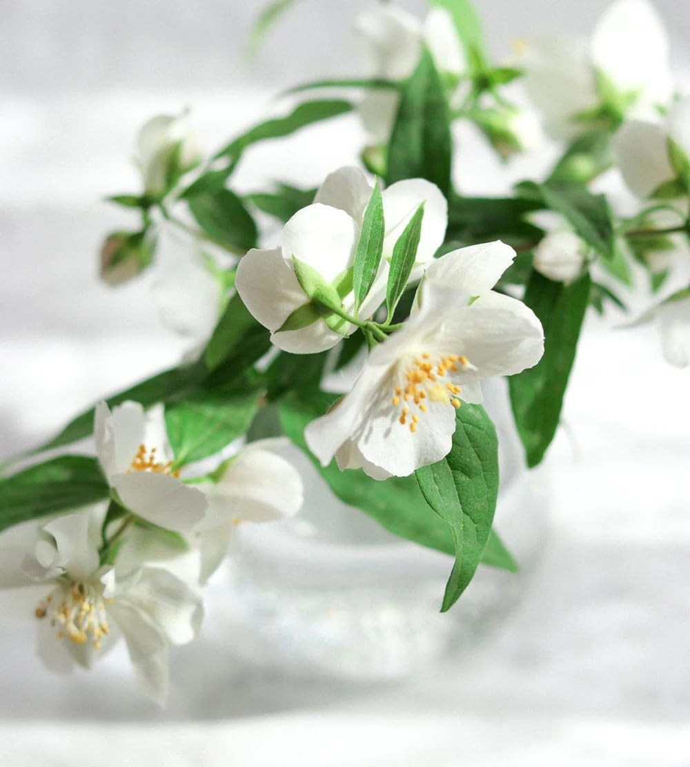 الجزء العلوي: الياسميون فاكهي أوراق اليلانج الخضراء، الوسطى: زهور بيضاء وعسل زهر البرتقال، القاعدة: الخوخ الأبيض المسك