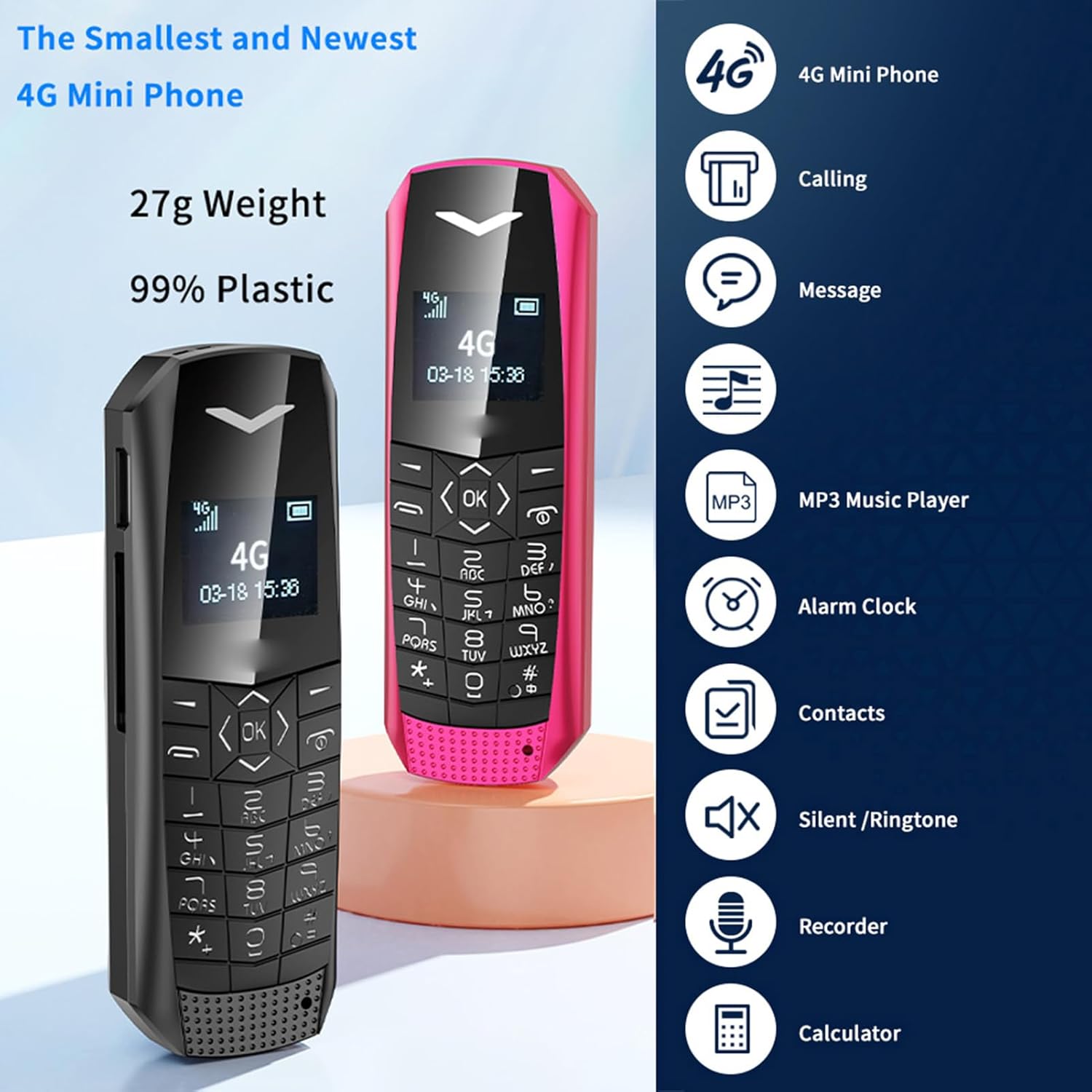 هاتف صغير: يتميز هذا الهاتف الخلوي بحجم صغير 70 × 23 × 12 ملم فقط، مما يجعله ليس أكبر من الإبهام وسهل الحمل. يركز تصميمه الفريد على الوظائف الأساسية لإجراء المكالمات وإرسال الرسائل.
