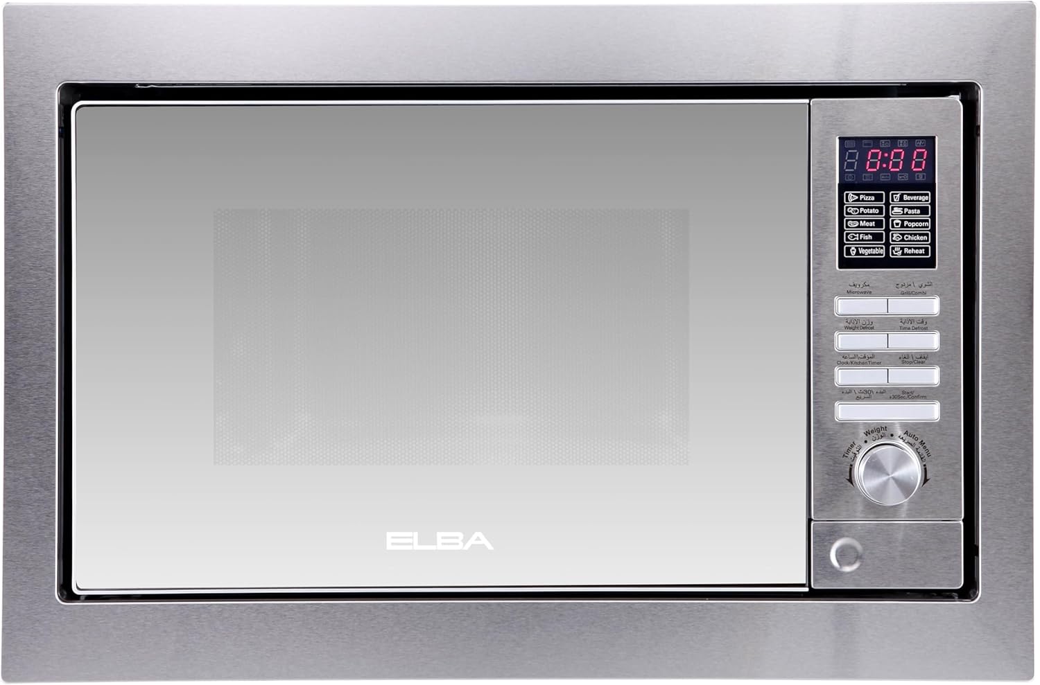 السعة والتصميم: ميكروويف مدمج بسعة 31 لتر مع وظيفة الشواء، يتميز بواجهة زجاجية أنيقة بلمسة نهائية عاكسة وإطار وتجويف من الستانلس ستيل الفاخر.