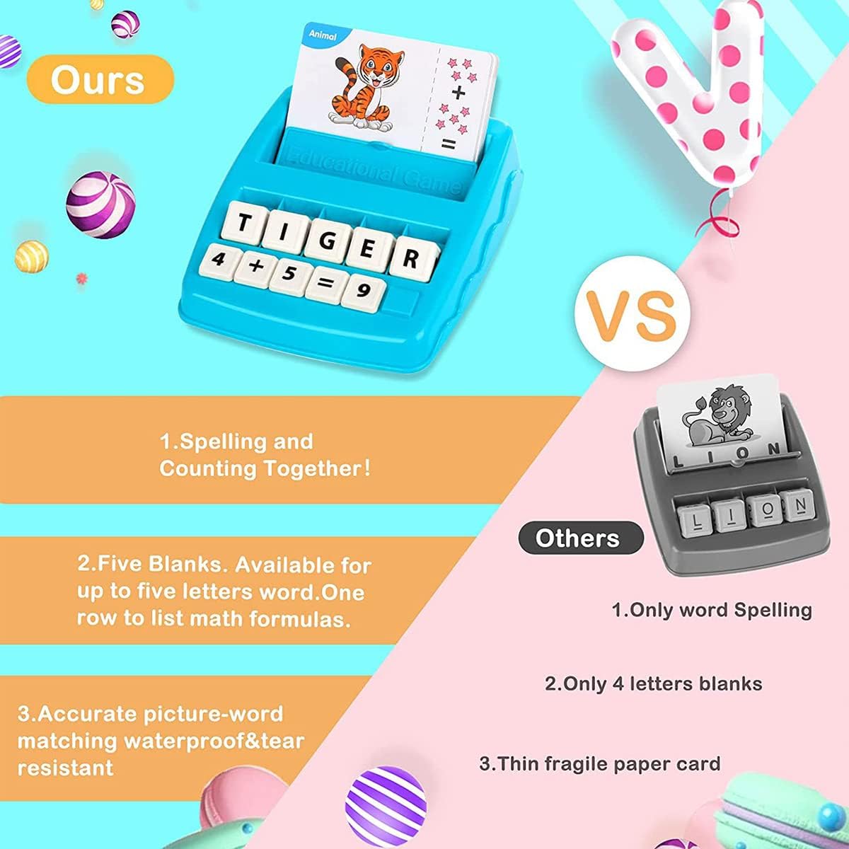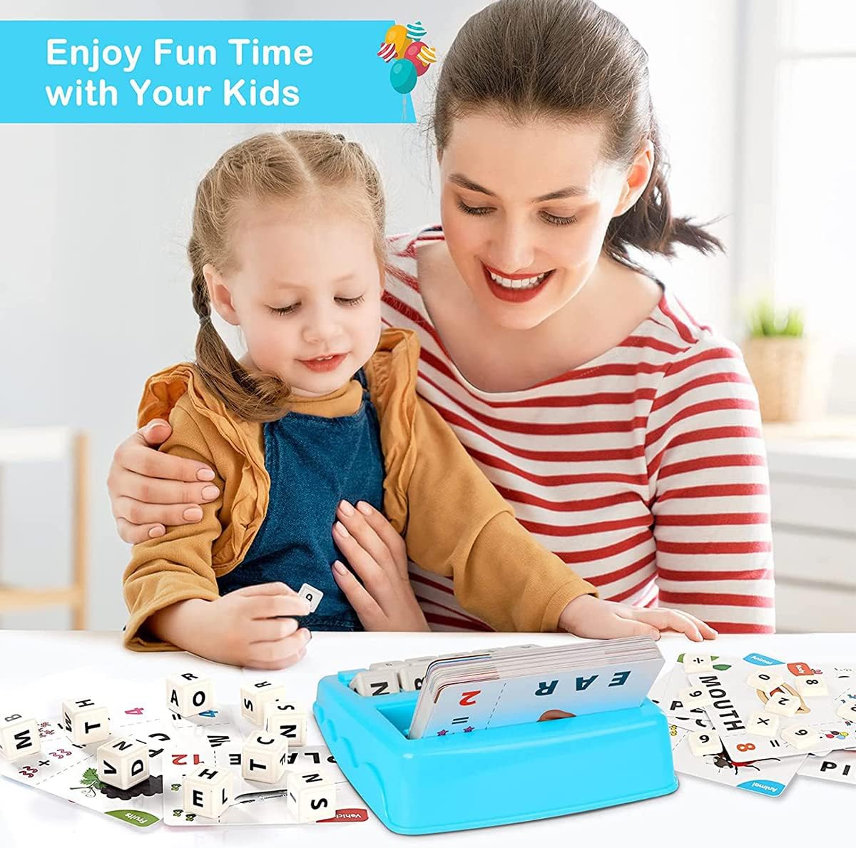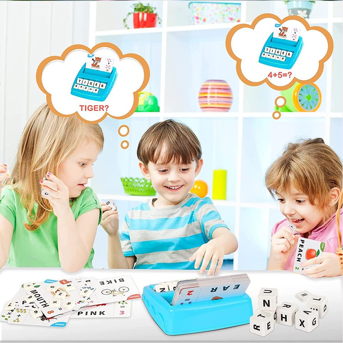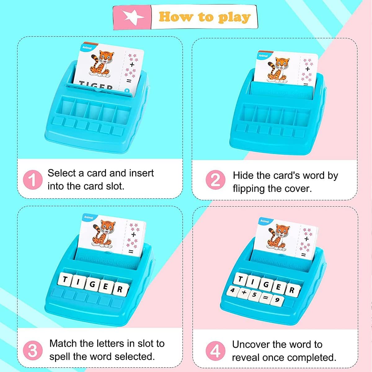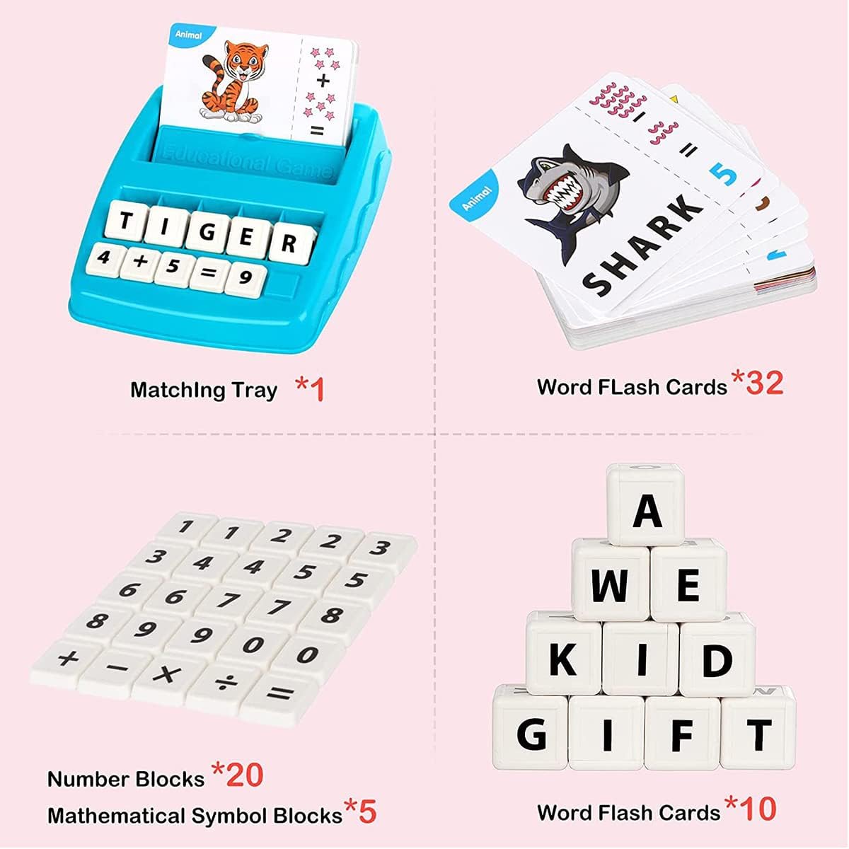 كيف تتفاعل مع الأطفال؟\n\n1. اختر بطاقة وأدخلها في فتحة البطاقة\n\n2. قم بإخفاء كلمة البطاقة عن طريق الغطاء القلاب.\n\n3. قم بمطابقة الحروف في الفتحة لتهجئة الكلمة المحددة.\n\n4. اكتشف الكلمة لتظهر عند الانتهاء.\n\nاللعبة رقم 1# – المطابقة الإملائية/الحساب\n\nقم بتغطية الكلمة والإجابة، ثم ابحث عن مكعبات الحروف وكتل الأرقام المقابلة واصنع الإجابة الصحيحة.\n\nاللعبة رقم 2# – لعبة إبداعية\n\nقم بإنشاء صور وكلمات ومسائل حسابية جديدة باستخدام أدوات مثل الجوال، ثم قم بالتوجيه للعمل على الإجابة الصحيحة.\n\nاللعبة رقم 3 – تعلم البطاقات التعليمية\n\nأشر إلى البطاقة ودع الأطفال يتعرفون على الحيوانات أو الطعام أو غيرها على البطاقات وتهجئتها، وهي مثالية للعديد من الأطفال للتواصل مع بعضهم البعض.\n\nتتضمن العبوة:\n\n1 × صينية مطابقة:\n\n32 × بطاقة\n\n10 × مكعبات حروف\n\n20 × مكعب أرقام\n\n5 × مكعبات برموز رياضية\n\n1 × دليل لعب (استخدام اللغة العربية غير مؤكد)