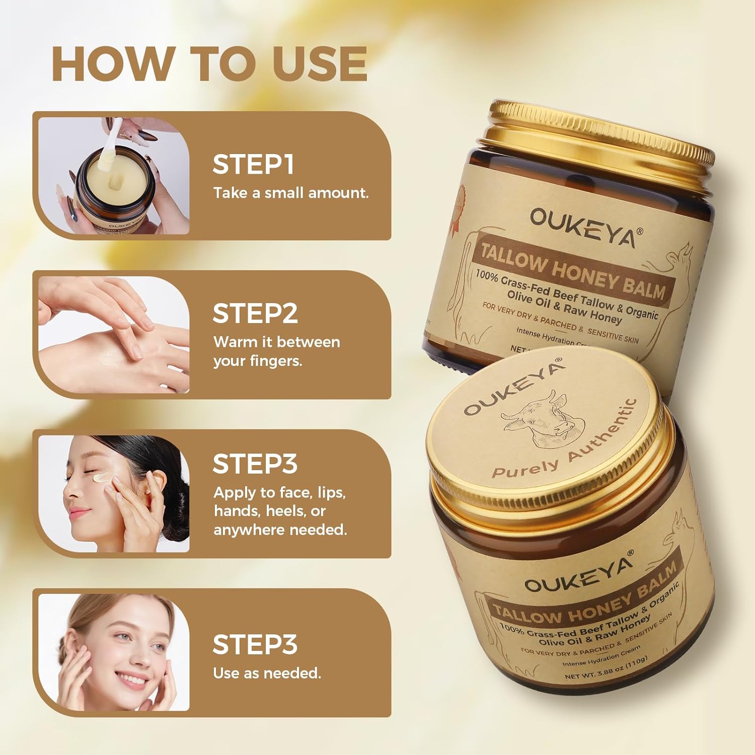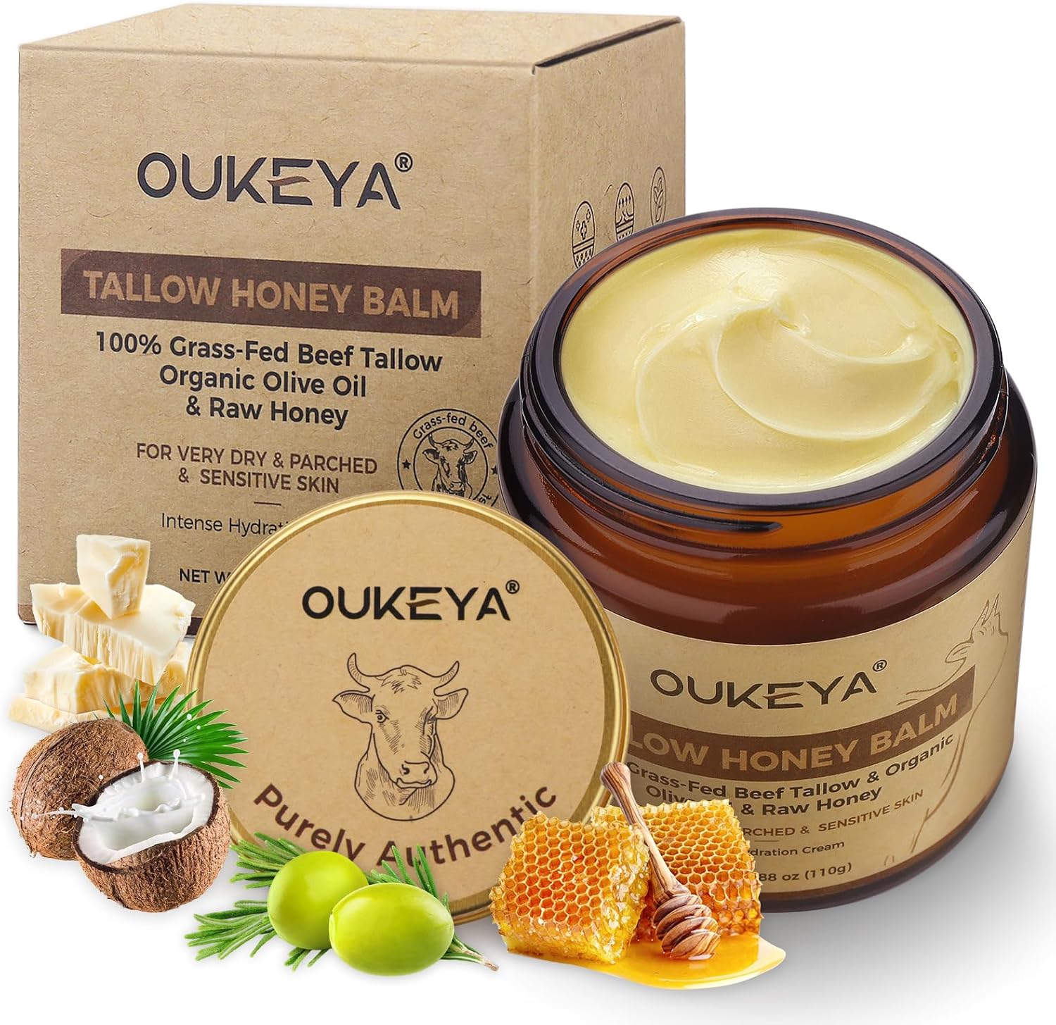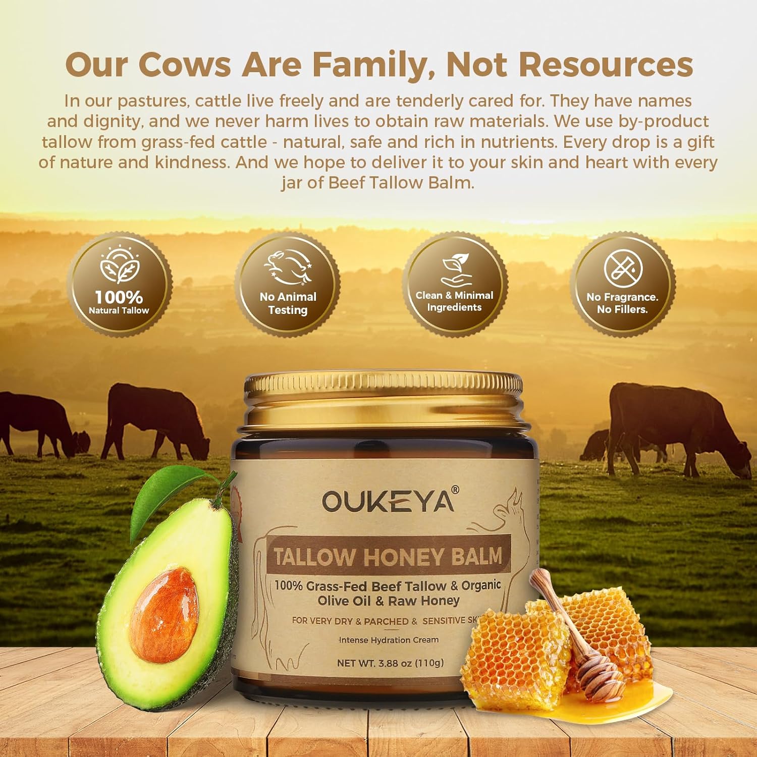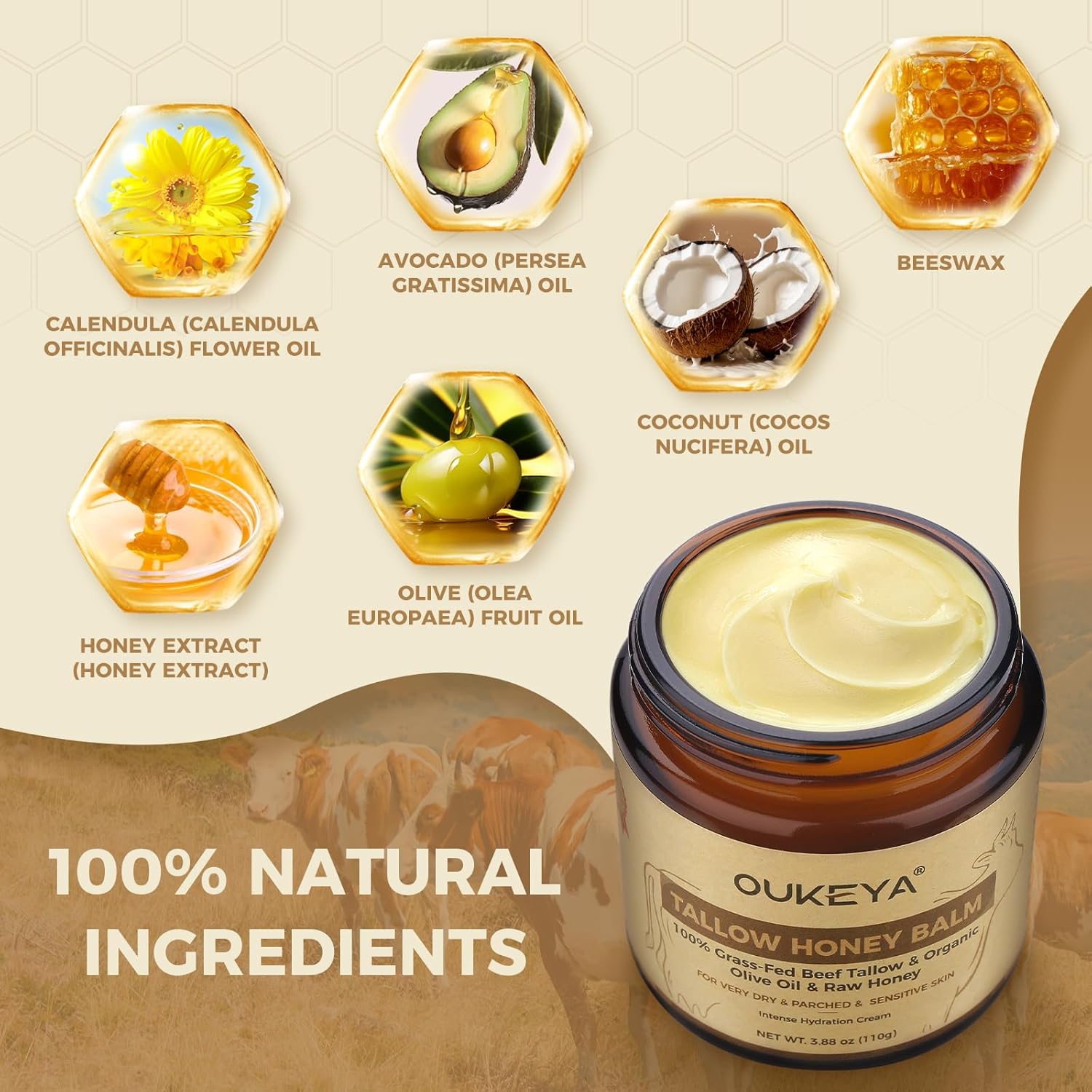 قاعدة شحم الشحم التي تتغذى على العشب وحاجز شمع العسل: يتميز بشحم طبيعي 100% من الماشية التي تتغذى على العشب من أجل توافق فائق للبشرة. يحبس شمع العسل الرطوبة ويشكل حاجزًا واقيًا للبشرة لترطيب دائم.