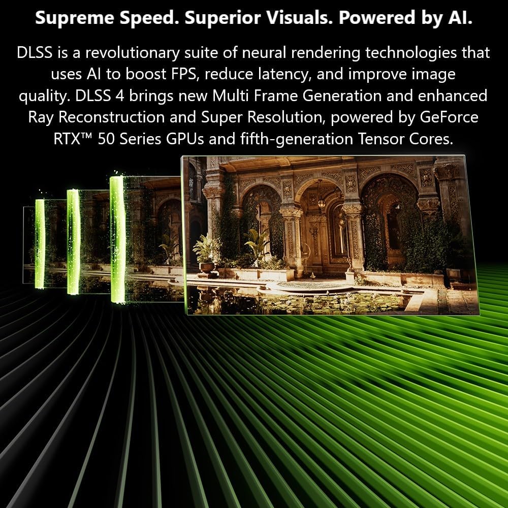 سرعة فائقة. مرئيات فائقة. مدعوم بالذكاء الاصطناعي: دي ال اس اس هي مجموعة ثورية من تقنيات العرض العصبي التي تستخدم الذكاء الاصطناعي لتعزيز إطار في الثانية وتقليل زمن الاستجابة وتحسين جودة الصورة. تقدم دي ال اس اس 4 جيلًا جديدًا متعدد الإطارات وإعادة بناء الأشعة المحسنة ودقة فائقة، مدعومة بوحدات معالجة الرسومات الجرافيكية جيفورس RTX 50 وكور تينسور من الجيل الخامس.