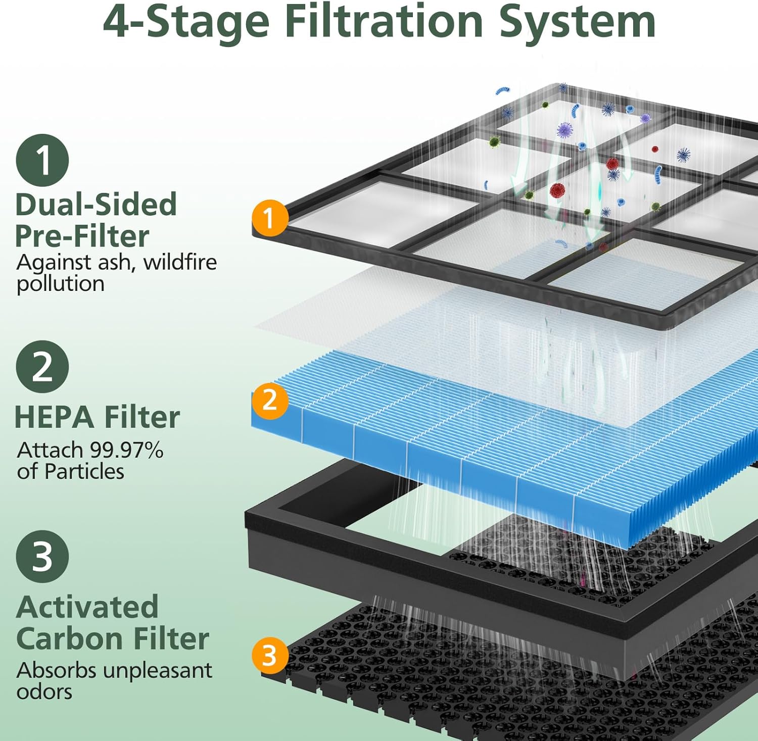 فلتر 4 في 1 – يتميز فلتر فيتال 100S-P البديل الخاص بنا بنظام ترشيح من 4 مراحل: ①②فلتر مسبق مزدوج الجوانب ③فلتر هيبا ④فلتر الكربون النشط. إنه أكثر فعالية ضد الرماد والتلوث الناجم عن دخان حرائق الغابات