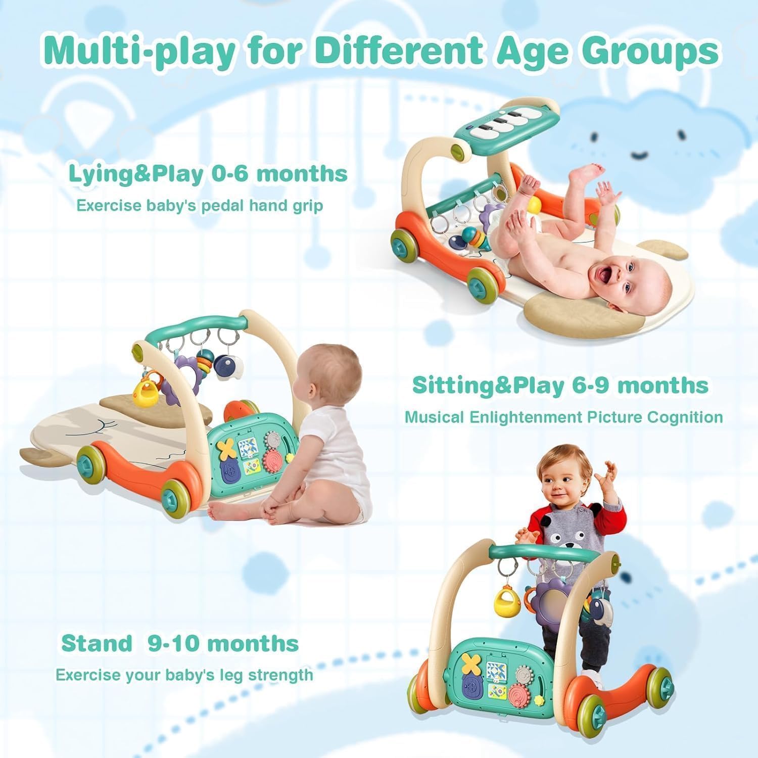 بساط لعب صالة الألعاب الرياضية للأطفال 3 في 1: يتكيف بساط لعب الأطفال الخاص بنا مع نمو طفلك، مع خيارات لعب مختلفة مثل الاستلقاء والجلوس واللعب وحتى العمل كمشاية دفع. مناسبة للأعمار من 0 إلى 12 شهرًا فما فوق، فهي تعزز النمو الصحي والسعادة.