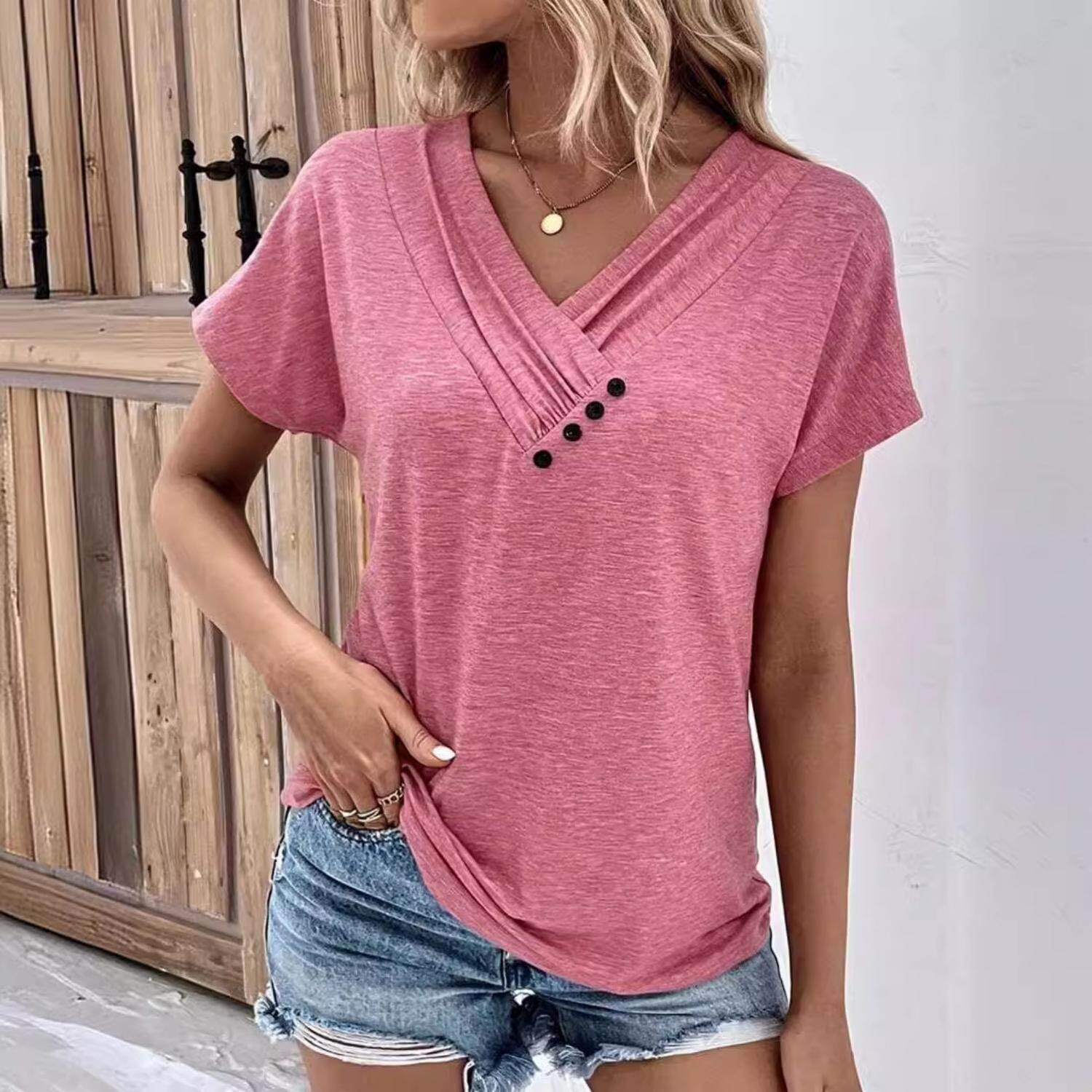 تي شيرت كاجوال فضفاض بلون سادة برقبة على شكل حرف V وأكمام قصيرة للبيع بالجملة