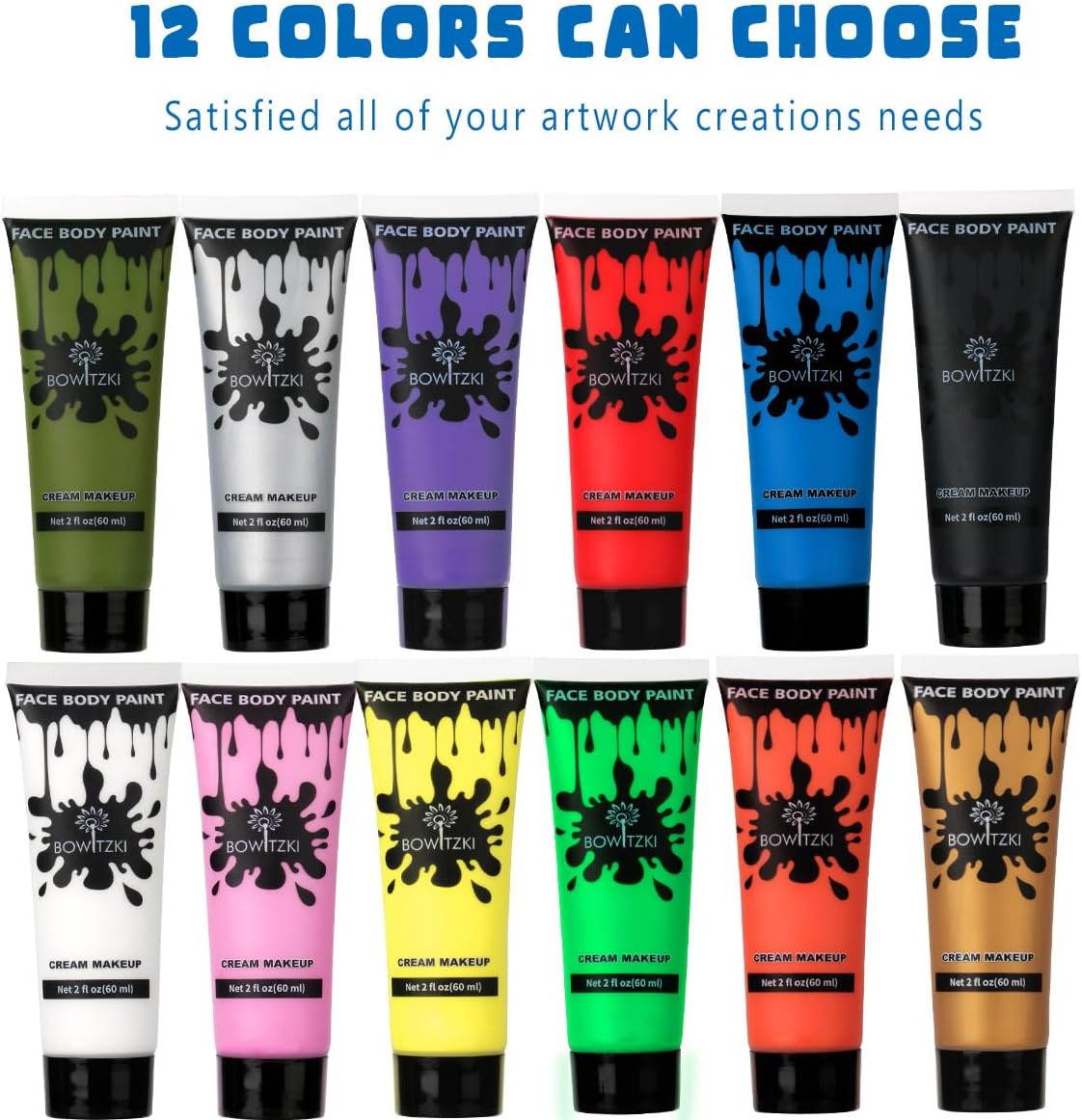 سعة كبيرة: يحتوي طلاء بوويتزكي Cream Face Body Paint على 60 مل من كل أنبوب (2 أونصة)، يتوفر 12 لونًا.