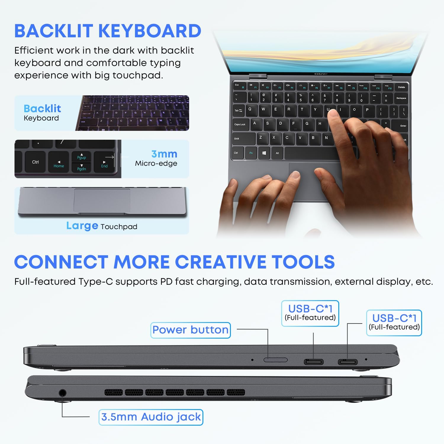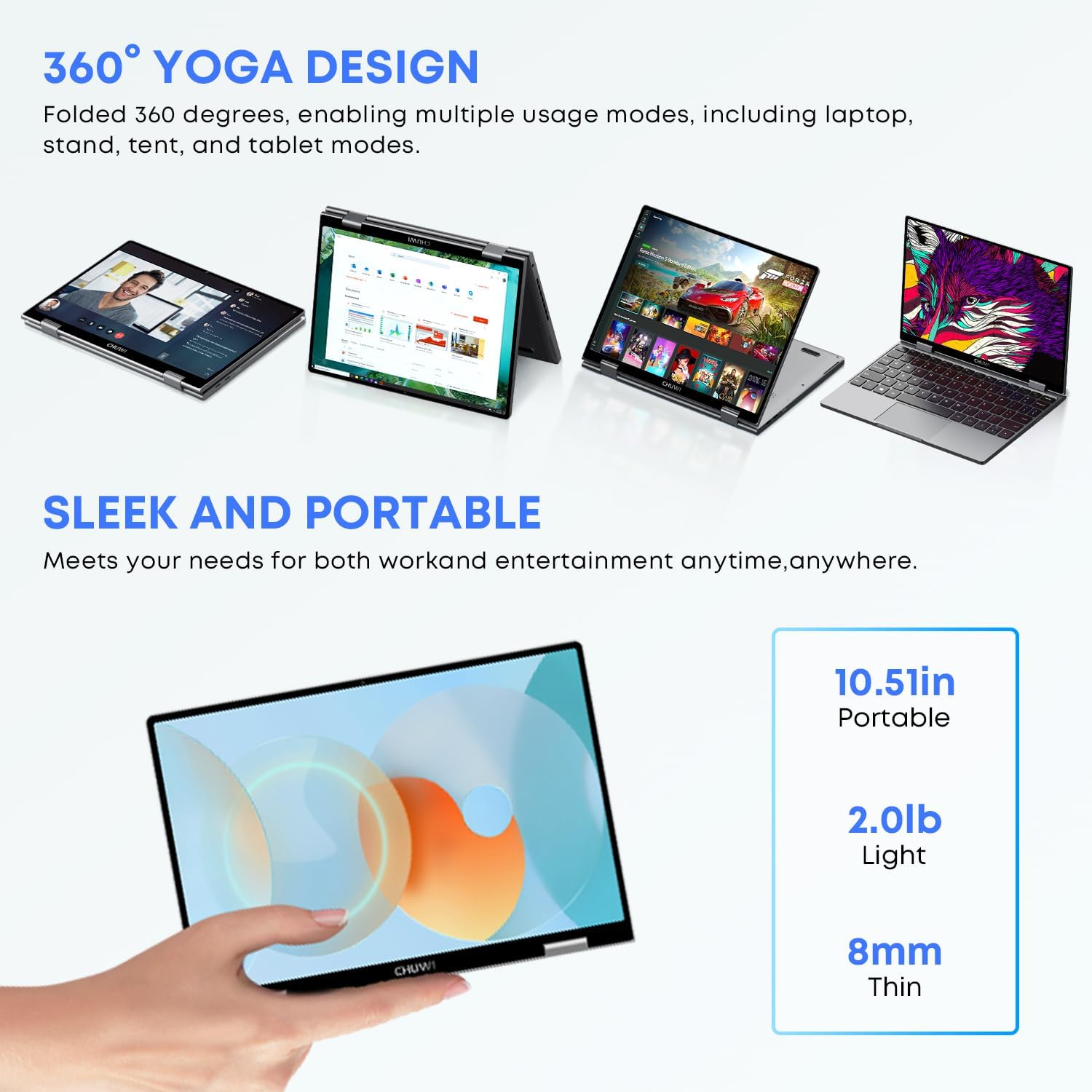 تصميم متعدد الاستخدامات 2 في 1: تمتع بالمرونة القصوى مع التصميم القابل للطي بزاوية 360 درجة لجهاز الكمبيوتر المحمول تشو وي MiniBook X الذي يعمل باللمس. قم بالتبديل بسهولة بين أوضاع اللاب توب والخيمة والتابلت، مما يجعله مثاليًا للعمل أو الترفيه أو المشروعات الإبداعية. هيكلها المعدني الأنيق، الذي يزن 2 باوند فقط ويبلغ قياسه 0.3 انش فقط عند أنحف نقطة، يجمع بين قابلية الحمل والمتانة، مما يجعله رفيقك المثالي للسفر.