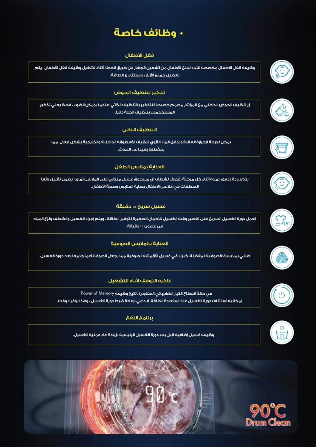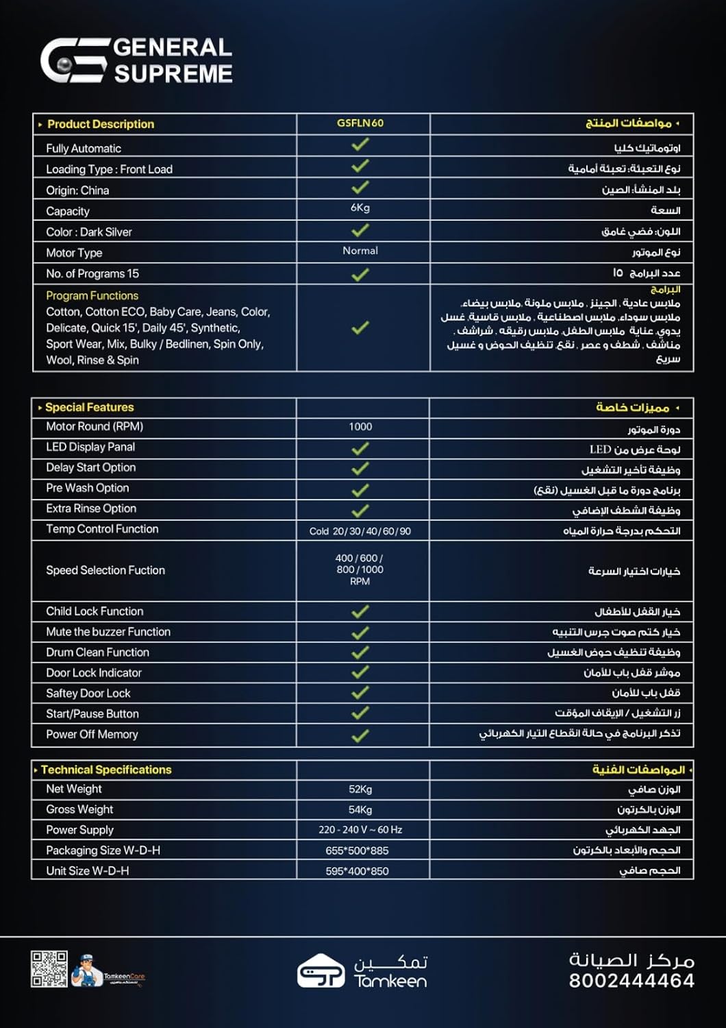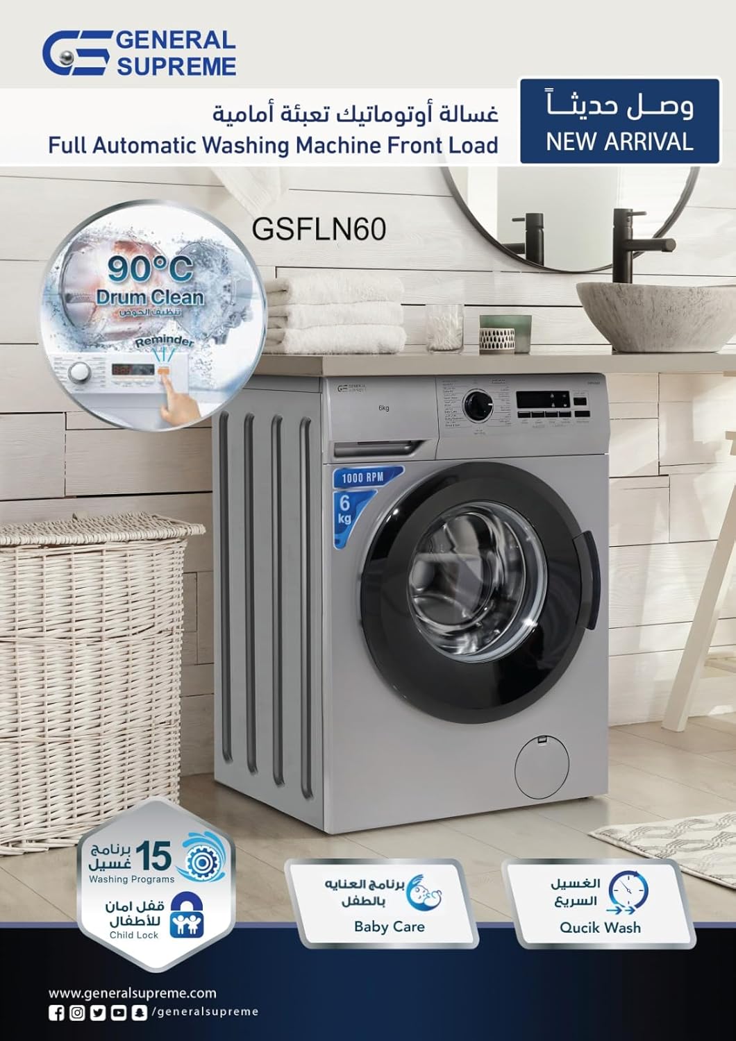 GSFLN60 جنرال سوبريم غسالة تعبئة أمامية 6 كيلو ، فضي , GSFLN60دلائل الميزات وظيفة تأخير التشغيل وظيفة تأخير التشغيل برنامج دورة ما قبل الغسيل (نقع ) برنامج دورة ما قبل الغسيل (نقع ) التحكم بدرجة حرارة المياه التحكم بدرجة حرارة المياه خيار القفل للأطفال خيار القفل للأطفال