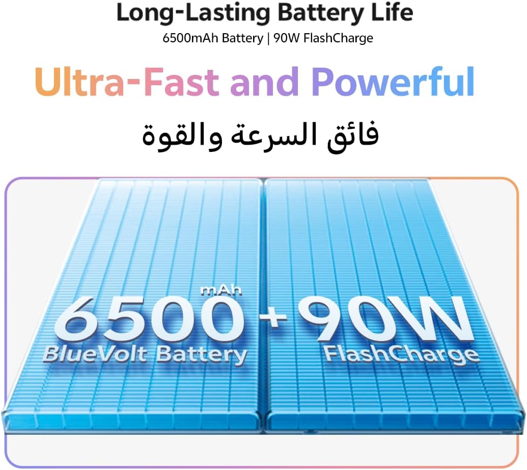 يتميز ببطارية تدوم طويلًا وشحن فائق السرعة: سيعمل بقوة طوال اليوم بفضل بطارية 6500 ميلي أمبير في الساعة، يشحن بشكل كامل في وقت قصير بفضل تقنية الشحن السريع بقدرة 90 واط المصممة لمواكبة نمط حياتك المتطلب.