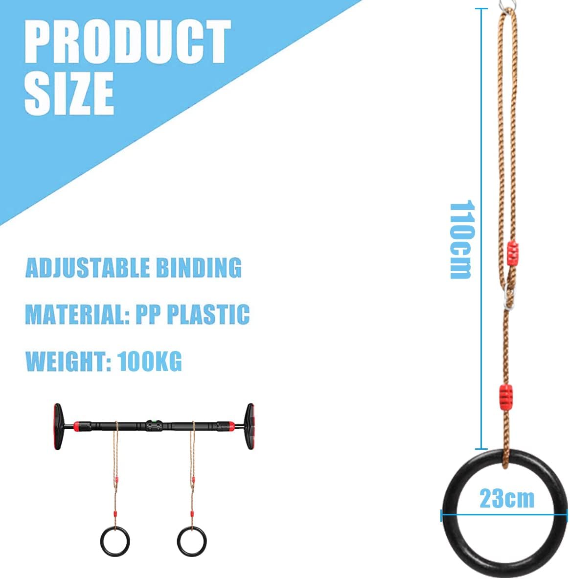 【سهلة التركيب والاستخدام】 تتميز حلقات الجمباز للأطفال هذه بسهولة التركيب. يستغرق تثبيت الحلقات بضع دقائق فقط. خطوة 1: قم بإلقاء الحبل فوق أو من خلال هيكل التركيب الخاص بك (شريط السحب، الجمالون، فرع الشجرة، إلخ)؛ الخطوة 2: قم بتوصيل حلقة الجمباز بالحبل. ما عليك سوى تثبيت حلقة التعليق في مكان آمن، يمكن استخدام حلقات السحب للأطفال بسرعة. هيكلها خفيف الوزن يجعل قضيب الأرجوحة للأطفال سهل الحمل والتخزين، مما يجعله مناسبًا للاستخدام في الأماكن الداخلية والخارجية.