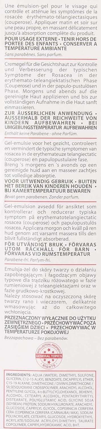علاج وظيفي رئيسي، لعمل مهدئ مكثف فوري يحارب احمرار الوجه المتقطع والدائم. يقلل من الإحساس بعدم الراحة الجلدية مثل اللسع والحرق. بعد شهرين من الاستخدام المنتظم، يكون هناك انخفاض كبير في رؤية الأوعية الدموية الصغيرة للوجه. التركيبة المتخصصة لهذا الجل الكريمي لطيفة للغاية وتترك البشرة منتعشة ورطبة.