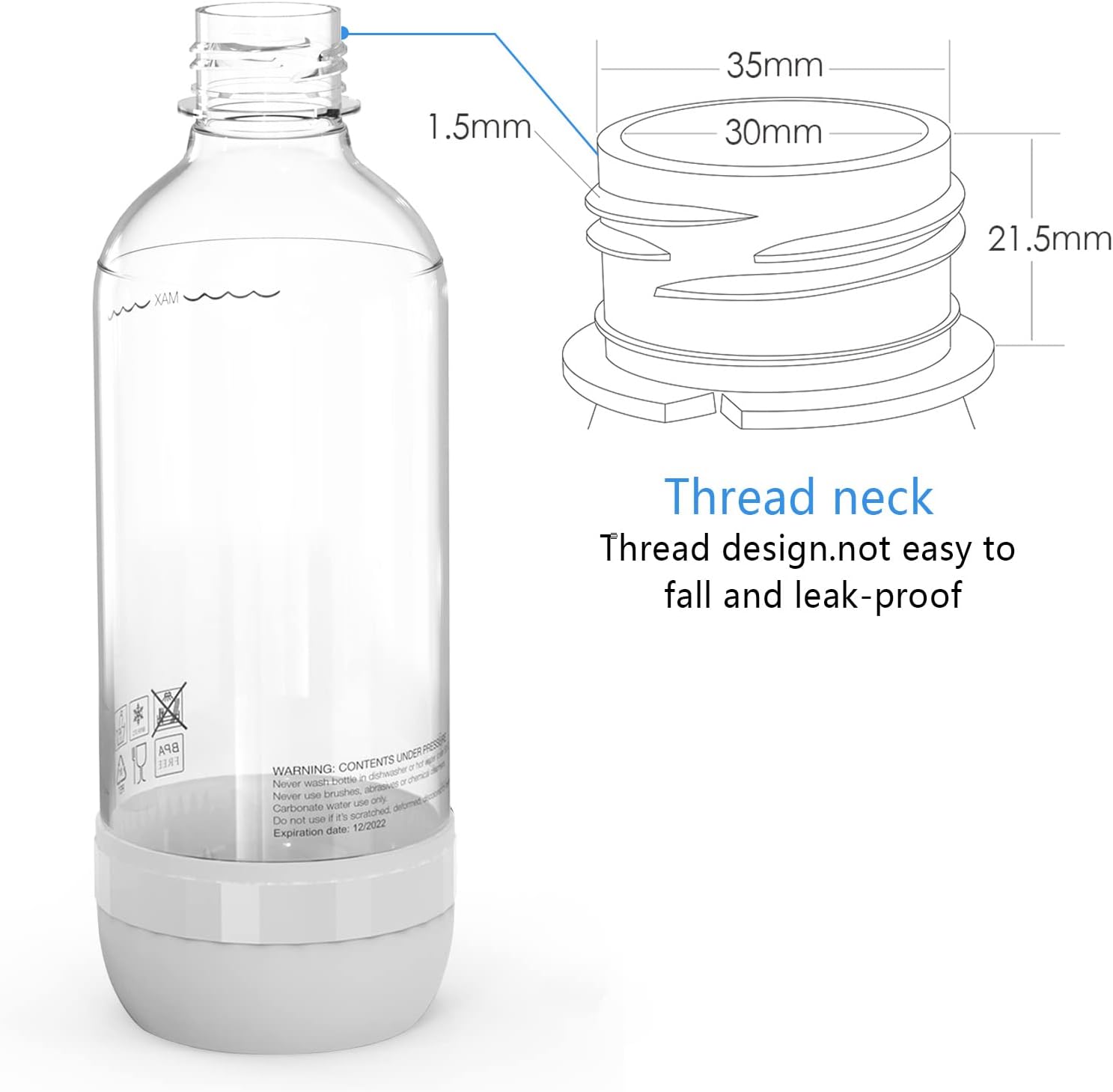 توافق قوي: زجاجة المياه الغازية متوافقة مع معظم آلات المياه الفوارة في السوق. يستخدم تصميم خيط رقبة ملولب لجعل من الصعب سقوطه ولديه إحكام جيد للهواء لمنع تسرب الماء.