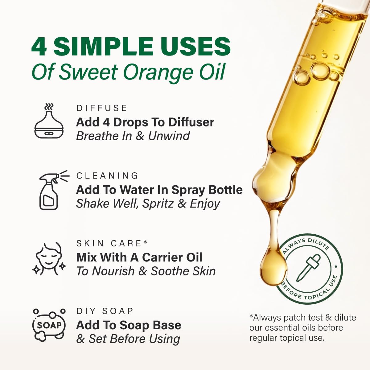 لمسة حمضية للعناية بالبشرة. يمكن استخدام زيوت البرتقال العطرية للاستخدام على البشرة لتعزيز مظهر البشرة الصافية والأكثر نعومة. للاستخدام الموضعي للبشرة، امزج قطرتين من زيوت البرتقال العطري الحلو مع زيت ناقل لصنع مصل البشرة.