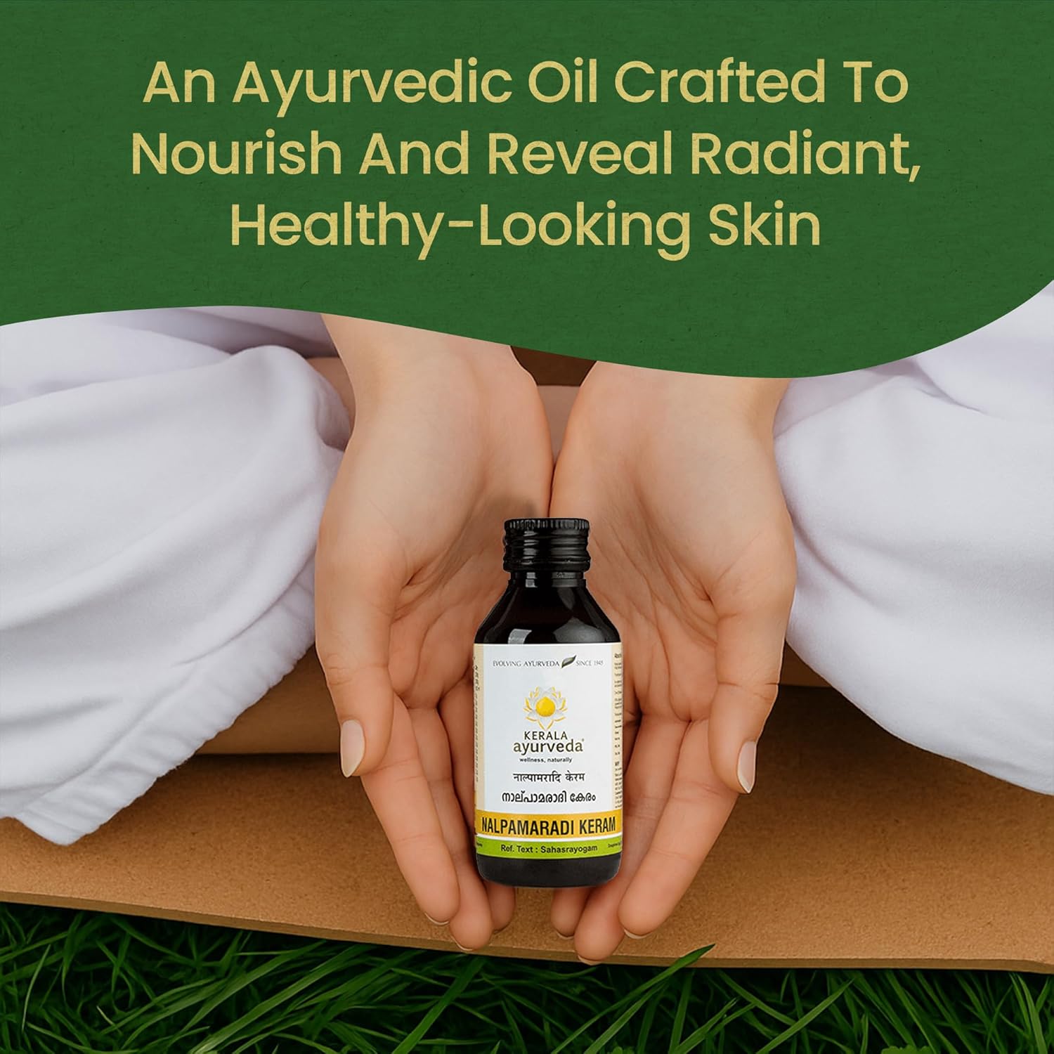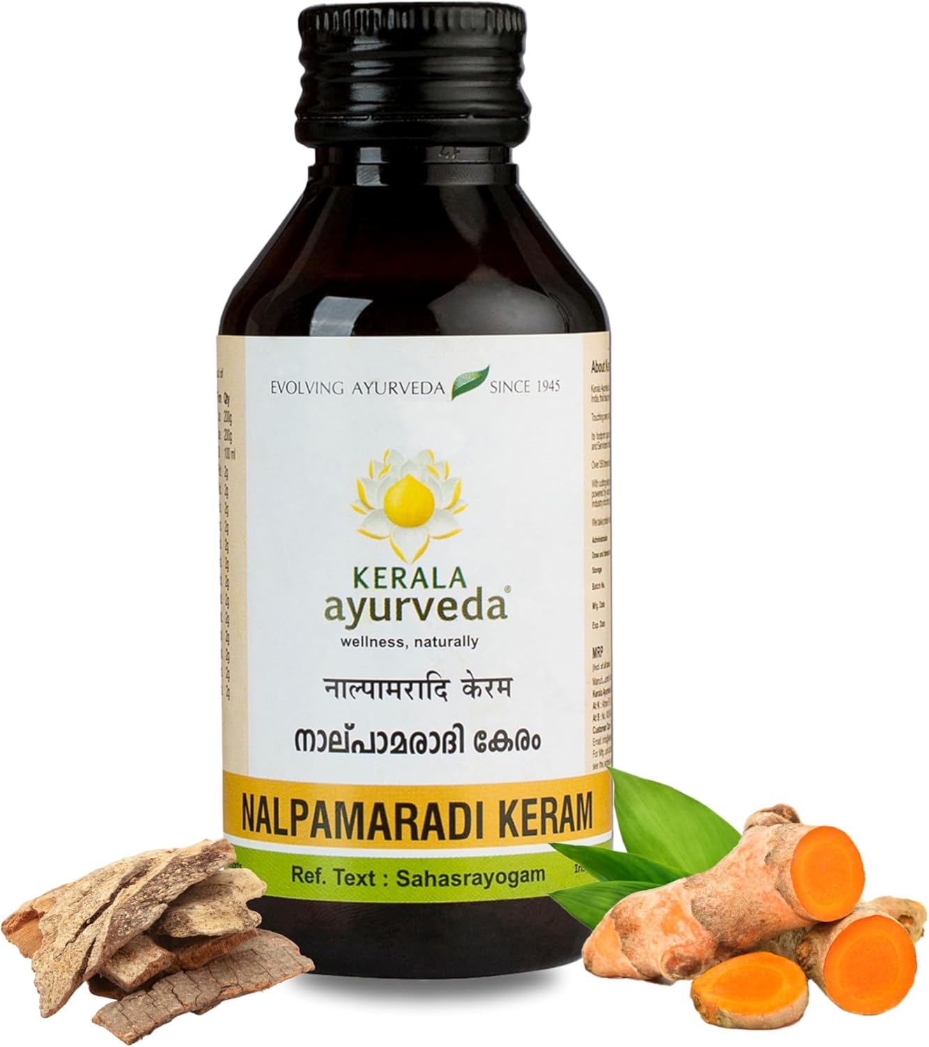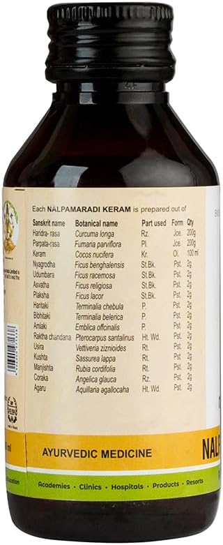 كيرالا ايورفيدا كريم نالبامارادي، زيت للوجه والجسم لفصل الصيف يزيل السمرة ويقلل من أضرار أشعة الشمس. غني بأعشاب “فارنيا” التي تزيل السمرة وتكشف عن بشرة ناعمة وندية ومتوهجة. يحمي الكركم أو الهاريدرا البشرة من أشعة الشمس ويخفف البقع الداكنة. لحاء أربعة أنواع من اللبخ أو نالبامارا يضيء البشرة. أعشاب تبرد وتعالج مثل نجيل الهند أو أوسيرا، تجدد البشرة وعنب الثعلب الهندي أو أملا، وتقلل من تسمير البشرة. يتم طهي هذه الأعشاب مع خشب الصندل الأحمر أو راكتاشاندانا أو المادر الهندي أو المانجيستا وغيرها في زيت جوز الهند. يتبع كريم كيرالا ايورفيدا نالبامارادي الوصفة الدقيقة الموجودة في نص الايورفيدا القديم ساهاسرايوغام، لمساعدة بشرتك على الإصلاح والشفاء من أضرار أشعة الشمس.