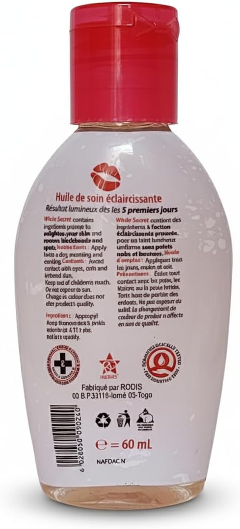 يعطي زيت وايت سيكريت للمعالجة والتبييض نتيجة مشرقة من الأيام الخمسة الأولى. يحتوي وايت سيكريت على مكونات ذات تأثير تفتيح مثبت لبشرة مشرقة ومتجانسة بدون الرؤوس السوداء والبثور وفيتامين اي الذي يعالج تغير لون البشرة القبيح والبقع الداكنة. مناسب لجميع أنواع البشرة.
