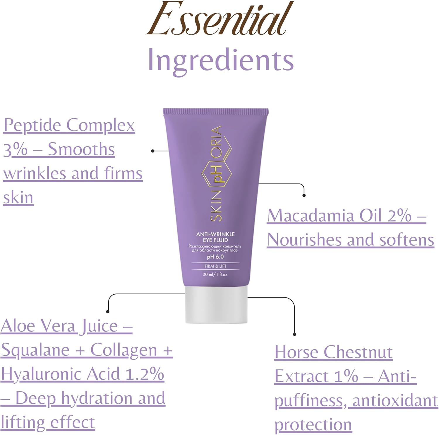 ضعي كمية صغيرة من الجل على بشرة نظيفة حول منطقة العين. مناسب للاستخدام في أي وقت من اليوم. يحتوي على محلول الببتيد بنسبة 3% وزيت المكاديميا و2% السكوالين والكولاجين وحمض الهيالورونيك بنسبة 1.2% ومستخلص الكستناء بنسبة 1%. بعد تنظيف البشرة حول العين، ضعي كمية صغيرة من الجل على البشرة حول العين.