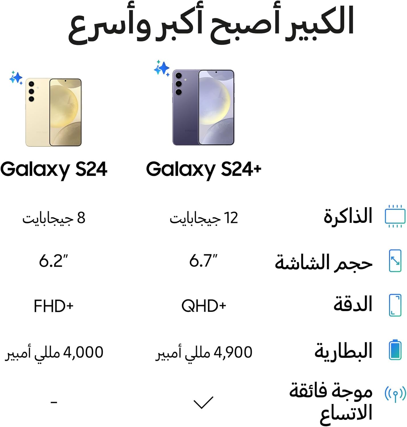 خياران حيويان لجوال جالكسي S24 وS24+. يحتوي جوال جالكسي S24+ على شاشة أكبر مع تقنية كيو اتش دي.