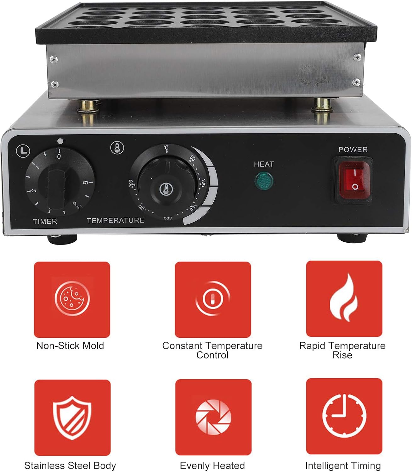 【تسخين فعال】مجهزة بأنبوب تسخين مركّز للطاقة، تضمن ماكينة المافن هذه تسخينًا متساويًا وارتفاع سريع في درجة الحرارة، مما يوفر لك الوقت والطاقة.