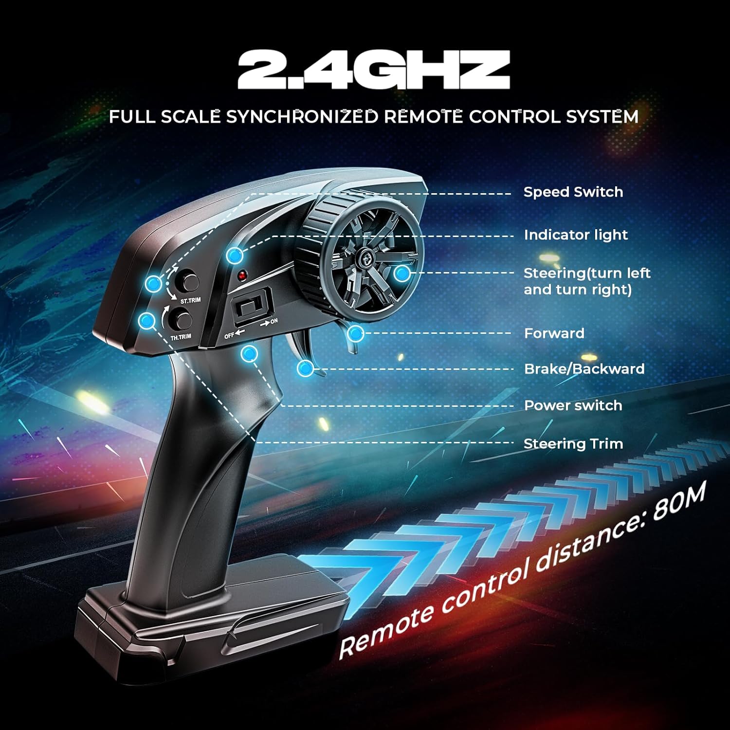 【تحكم مضاد للتداخل بتردد 2.4 جيجاهرتز】استمتع بتوجيه سلس وسريع الاستجابة مع جهاز تحكم عن بعد طويل المدى 2.4 جيجاهرتز، مما يسمح للعديد من السيارات بالسباق في وقت واحد دون اشتباكات الإشارة.