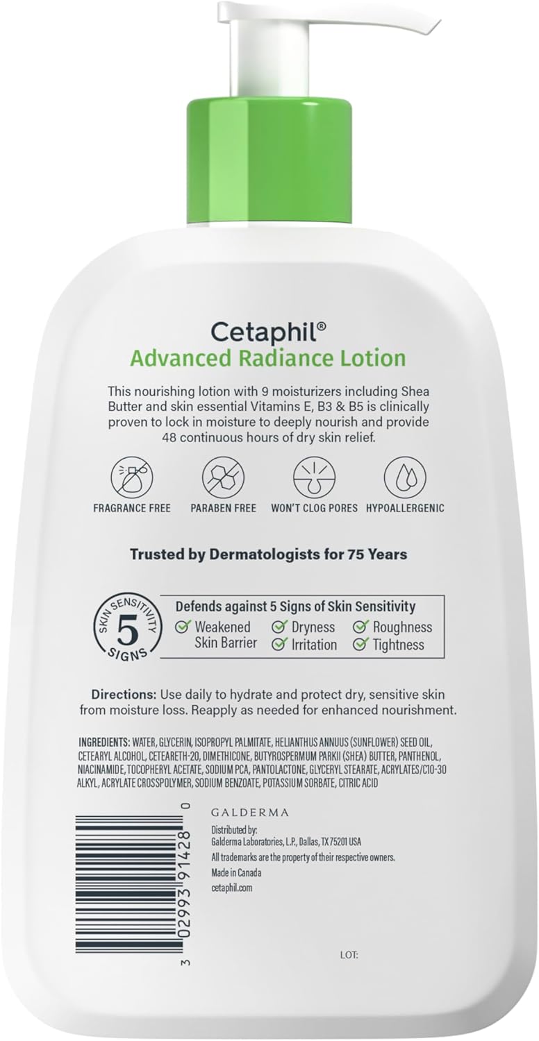 سيتافيل لوشن ادفانسد راديانس يكشف عن بشرة أكثر إشراقًا في استخدام واحد. يتكون من تسعة مكونات مرطبة، بما في ذلك زبدة الشيا، لتجديد واستعادة البشرة الجافة والباهتة. غني بمزيج من المكونات الرئيسية: الجلسرين المرطب والبانثينول (فيتامين B5) لترطيب وتهدئة والحفاظ على حاجز البشرة، والنياسيناميد (فيتامين B3) للمساعدة على تنعيم ملمس البشرة والحفاظ على حاجز رطوبة البشرة. يعمل هذا اللوشن الغني على تحسين ملمس البشرة ولمعانها على الفور، ويوفر راحة طويلة الأمد لمدة 48 ساعة من الجفاف. استخدمه يوميًا لتغذية البشرة الجافة والمساعدة على استعادة الحاجز الطبيعي للبشرة في أسبوع واحد فقط. استخدمه مع كريم ادفانسد راديانس لترطيب البشرة بشكل مستمر واستعادة المناطق الأكثر جفافاً مثل اليدين والقدمين والركبتين والمرفقين. هذه التركيبة الفريدة لا تسبب الحساسية ولا تسبب كوميدوغينيك (لذلك لن تسد المسام) وخالية من العطور والبارابين، وقد ثبت سريريًا أنها لطيفة على جميع ألوان البشرة وأنواعها. يحمي بفعالية من 5 علامات لحساسية البشرة.
