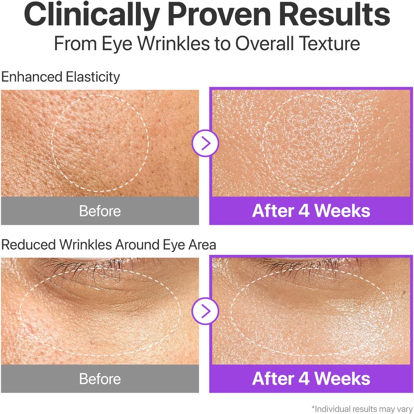 [تم اختباره سريريًا] ثبت سريريًا أنه يقلل من 11 نوعًا من التجاعيد (تجاعيد وخطوط الجبهة وبين الحاجبين وحول العين وتحت العين والأنف والشفاه وخطوط الابتسامة وزوايا الفم والذقن والرقبة) في 4 أسابيع فقط.