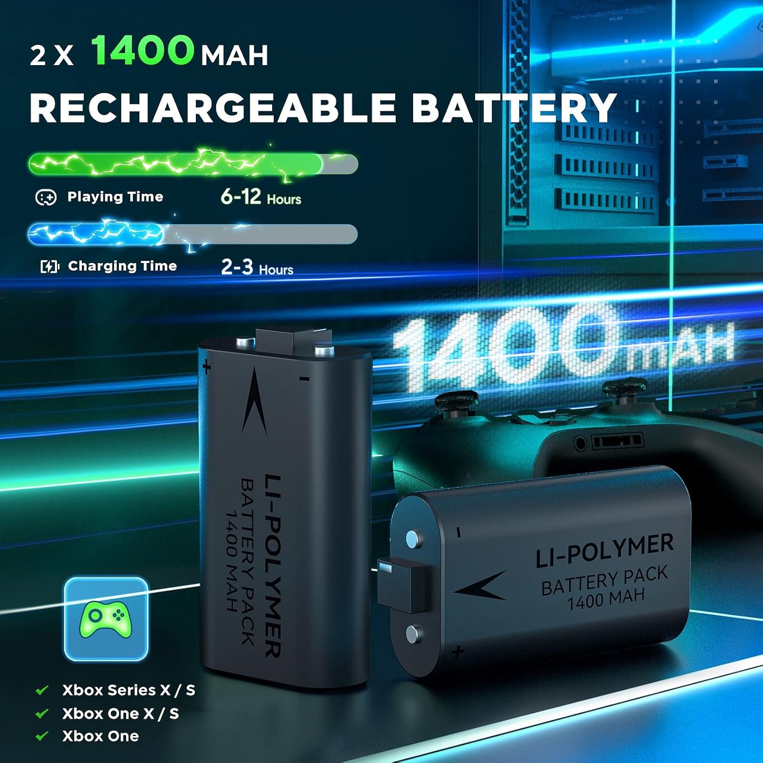 2 × بطارية قابلة لإعادة الشحن 1400 مللي أمبير في الساعة: تحتوي العبوة على بطاريتين قابلتين لإعادة الشحن لوحدات التحكم Xbox Series X. ببساطة قم بمحاذاة البطارية مع قاعدة الشحن للشحن السريع. تأتي هذه البطاريات مع آليات حماية متعددة لضمان السلامة وإطالة عمرها.