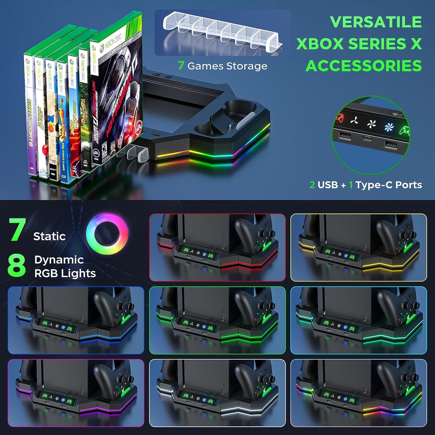 نظام تبريد لجهاز Xbox Series X: حافظ على جهاز Xbox Series X الخاص بك باردًا مع قاعدة الشحن متعددة الوظائف. تتضمن مروحة تبريد علوية مع مصابيح RGB ومحطة شحن مزدوجة لوحدة التحكم وبطاريتين قابلتين لإعادة الشحن و7 فتحات لتخزين أقراص الألعاب. حل مثالي الكل في واحد لإدارة وحدة التحكم وأجهزة التحكم والألعاب!