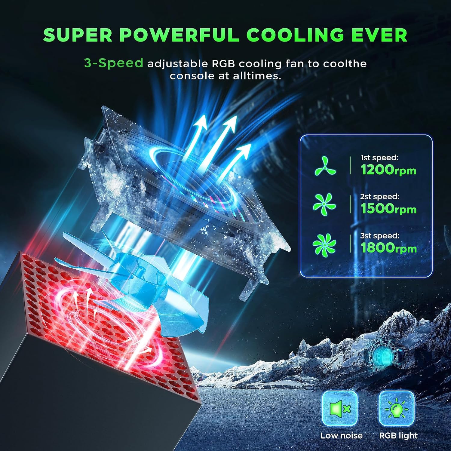 ️ مروحة تبريد ذكية بثلاث سرعات: اختر من بين 3 سرعات للمروحة (1200 و1500 و1800 دورة في الدقيقة) للحفاظ على برودة وحدة التحكم الخاصة بك. تضيف إضاءة ليد الفضاء اللوني ار جي بي أجواء ممتعة، مع إطفاء الأضواء عند إيقاف تشغيل المروحة. يضمن نظام التبريد دوران هواء أفضل وأداء يدوم لفترة أطول لجهاز Xbox Series X.