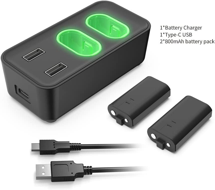 【توافق ممتاز】عبوات بطاريات قابلة لإعادة الشحن لجهاز Xbox One/S/X/Elite/Series X|S. يأتي مع 2 بطاريات اكس بوكس سلسلة اكس قابلة لإعادة الشحن وشاحن بطارية، لن تحتاج إلى شراء بطاريات ايه ايه بعد الآن، يمكن إعادة شحن بطاريتين اكس بوكس ون بسعة 800 مللي أمبير في الساعة حتى 2000 مرة.