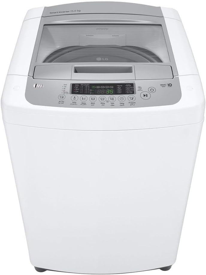 غسالة علوية LG بسعة 15 كجم بلون أبيض. تقنية الإنفرتر الذكية لأداء هادئ وتوفير الطاقة. مصممة لتتعامل مع الملابس اليومية والقطع الحساسة بسهولة، مع برامج متعددة تضبط الحرارة والسرعة ومدة الدورة للحصول على نظافة متقنة مع تقليل الاهتراء. تصميم فتح علوي مريح مع تدفق ماء قوي يزيل الأوساخ العالقة دون إتلاف الأقمشة.