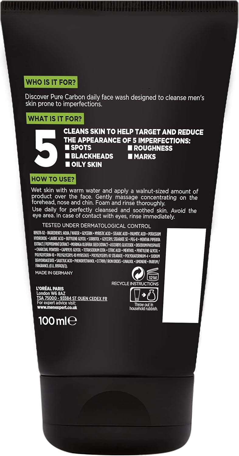 اكتشف غسول الوجه اليومي بالفحم النقي المصمم لتنظيف بشرة الرجال المعرضة للعيوب. ينظف البشرة للمساعدة في استهداف وتقليل ظهور 5 عيوب: – البقع – الرؤوس السوداء – البشرة الدهنية – الخشونة – علامات البشرة الرطبة بالماء الدافئ ووضع كمية من المنتج بحجم الجوز على الوجه. دلكي بلطف مع التركيز على الجبهة والأنف والذقن. قم برغوة واشطفيه جيدًا. استخدمه يوميًا للحصول على بشرة نظيفة ومهدئة بشكل مثالي. تجنبي منطقة العين. في حالة ملامسته للعينين، اشطفيه على الفور.