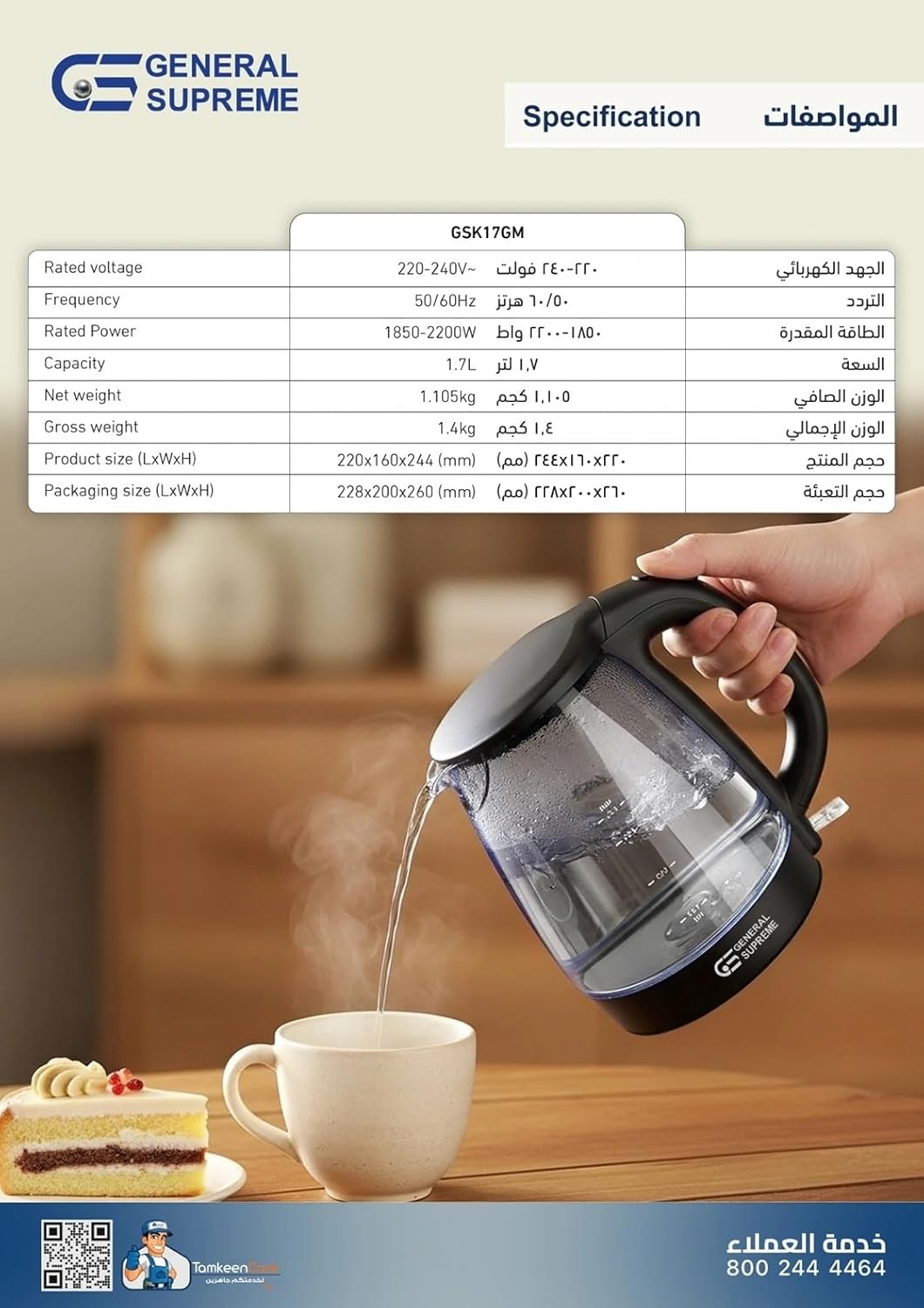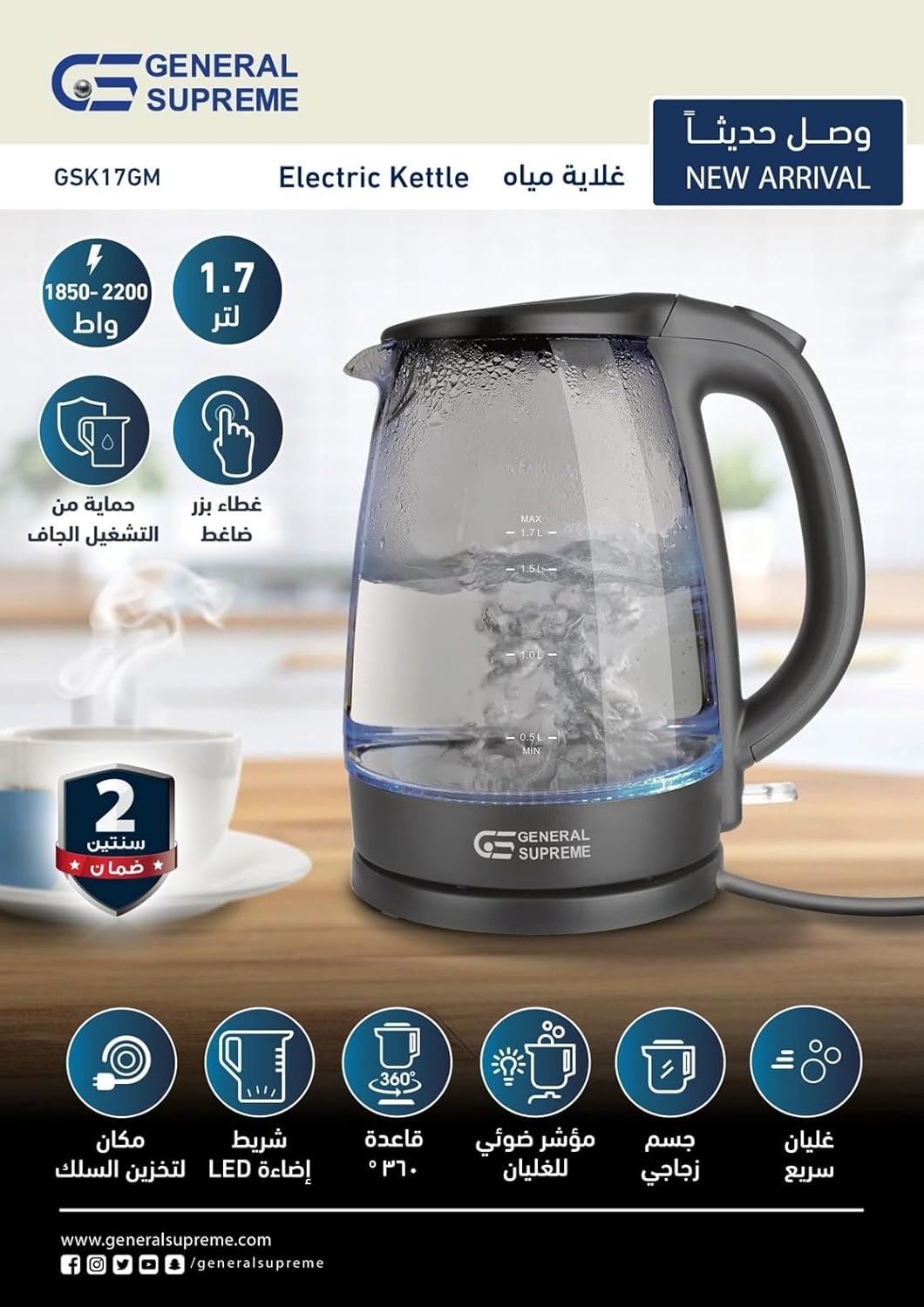 السعة: غلاية زجاجية شفافة كبيرة سعة 1.7 لتر مثالية لتقديم أكواب متعددة من الماء الساخن في وقت واحد.