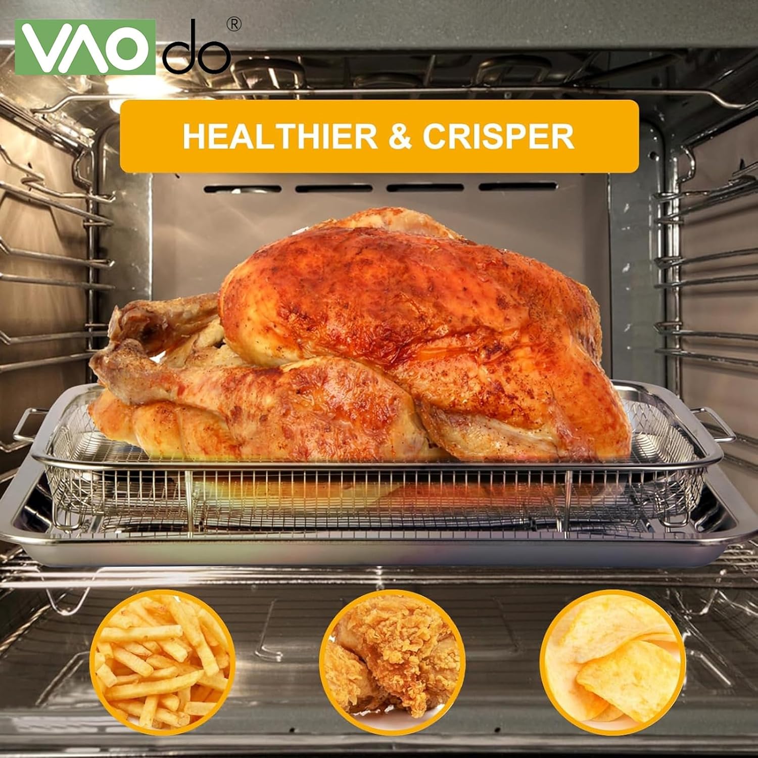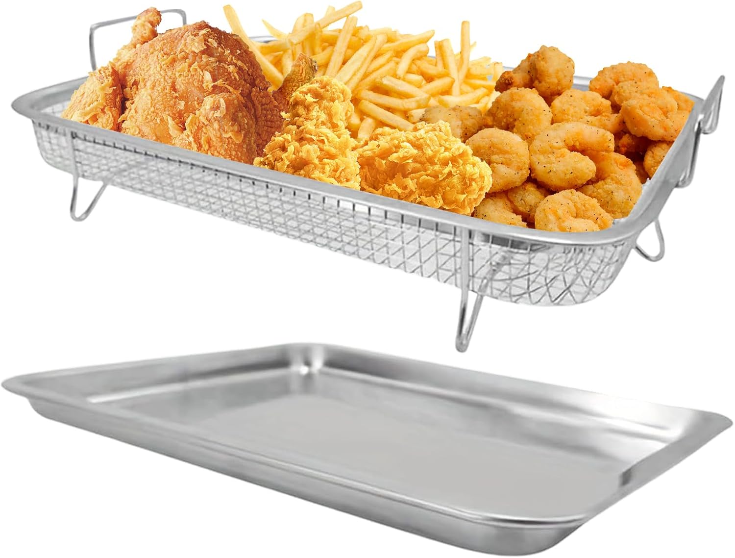 فااو دو سلة مقلاة هوائية للفرن مقاس 39.2 × 29.3 × 5.5 سم غير لاصقة مع صينية خبز، صينية خبز من الستانلس ستيل مع مجموعة رف، مع طلاء غير لاصق، للبطاطس المقلية ولحم الخنزير المقدد والدجاج