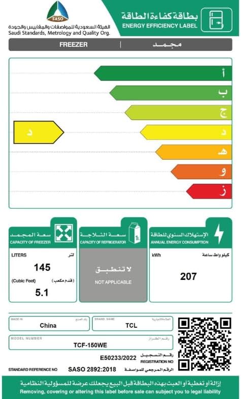 تصنيف الطاقة: استهلاك الطاقة السنوي 207 كيلو واط ساعة، مما يساعد على إدارة تكاليف الكهرباء مع الحفاظ على أداء التجميد الأمثل