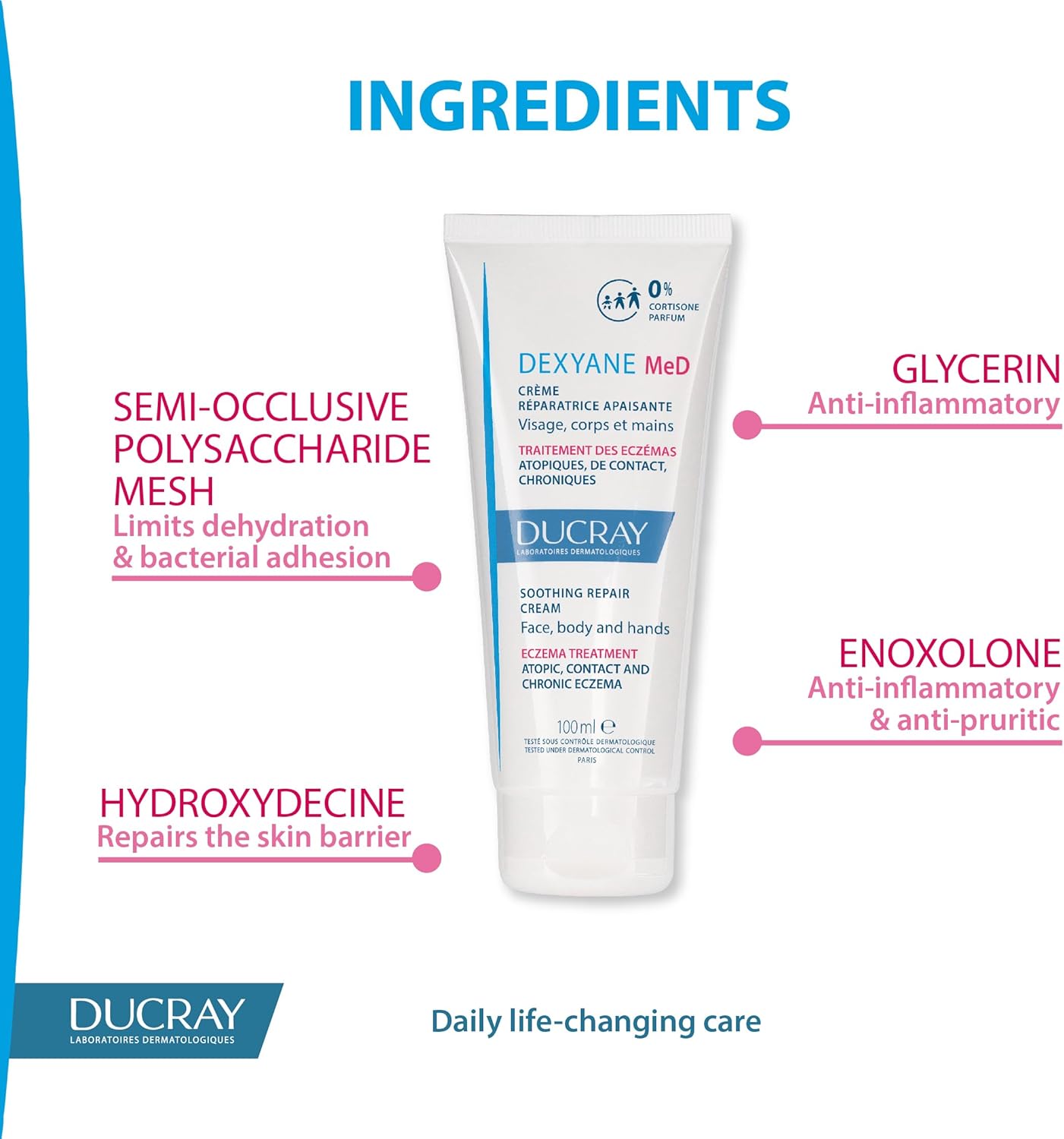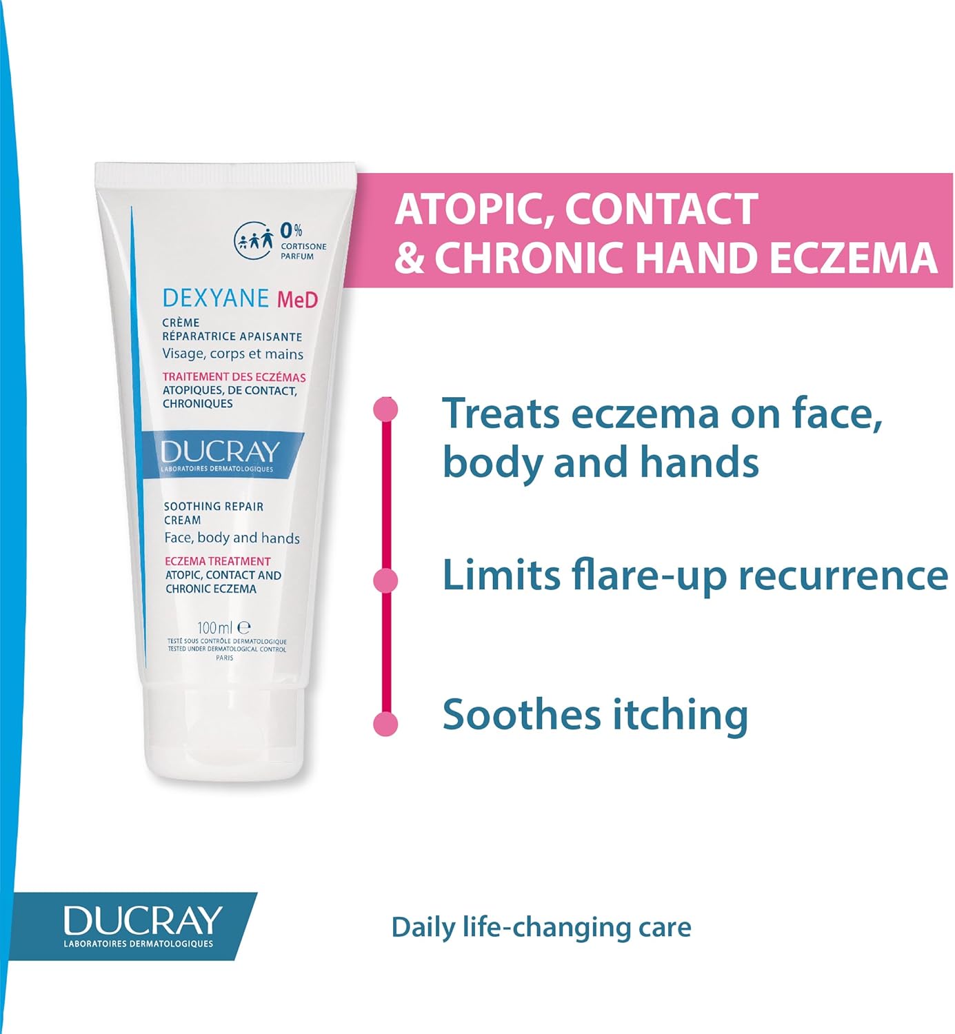 كريم الإصلاح المهدئ من ديكسيان ميد يعالج ويصلح ويحد من تكرار آفات الأكزيما. يضمن “تأثير الملابس فائق الترطيب” حماية البشرة.