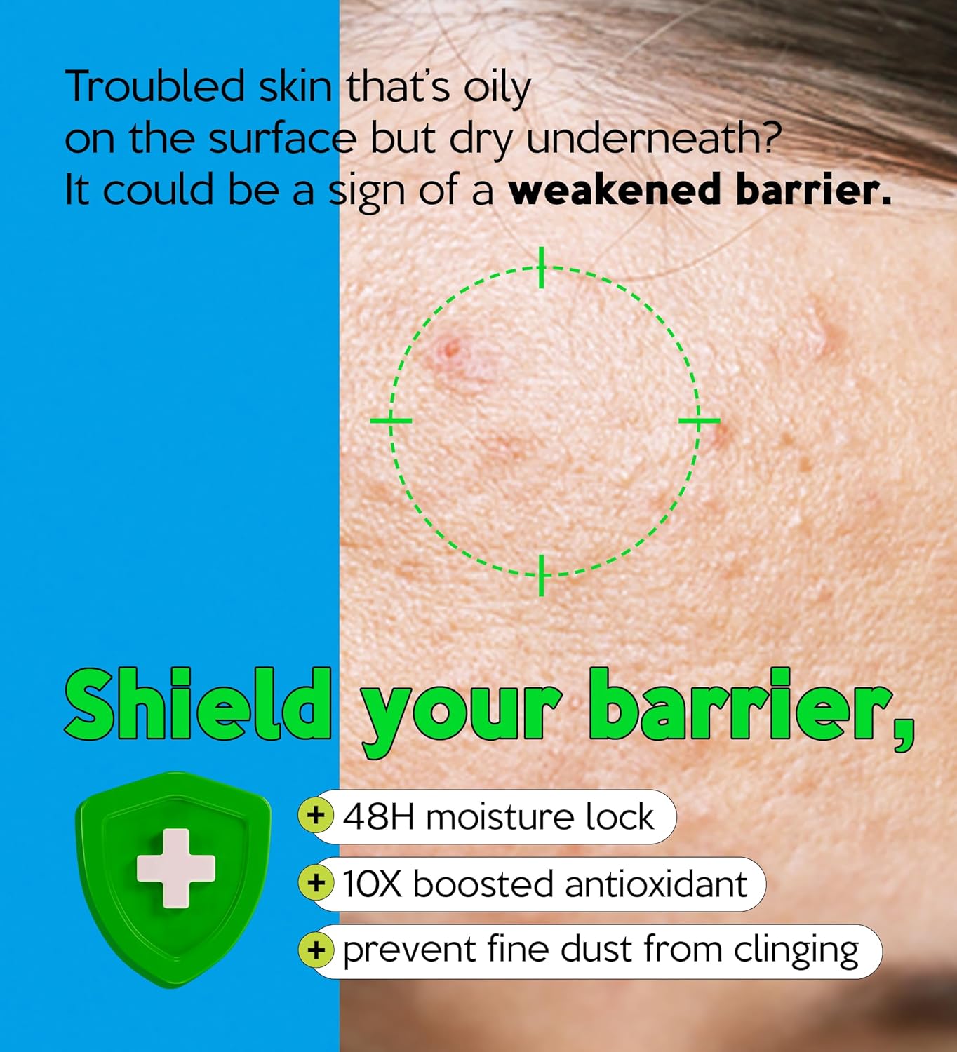 مرطب قوي للوجه. تم تركيب مرطب الوجه هذا للبشرة الجافة للأفراد ذوي البشرة الدهنية التي تعاني من نقص الماء لمواجهة التحدي المتمثل في وجود سطح دهني ولكن بشرة جافة تحتها مع الحفاظ على مستوى منخفض من الأس الهيدروجيني لتعزيز الحاجز الطبيعي للبشرة.