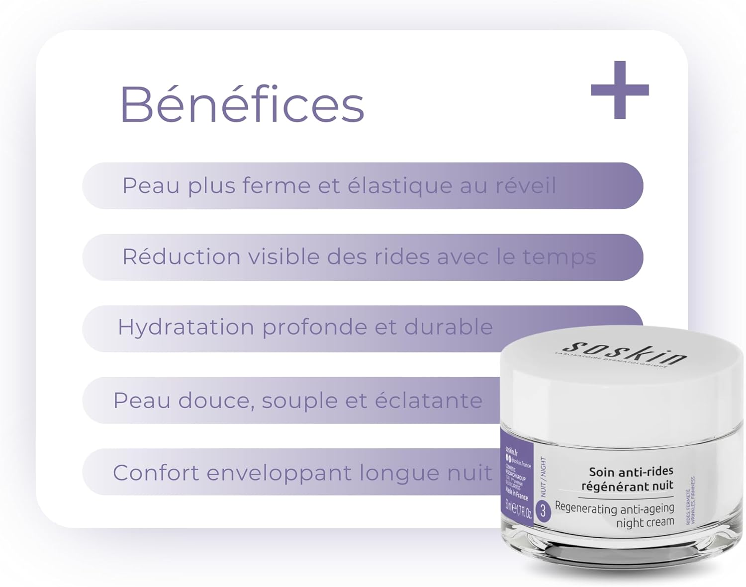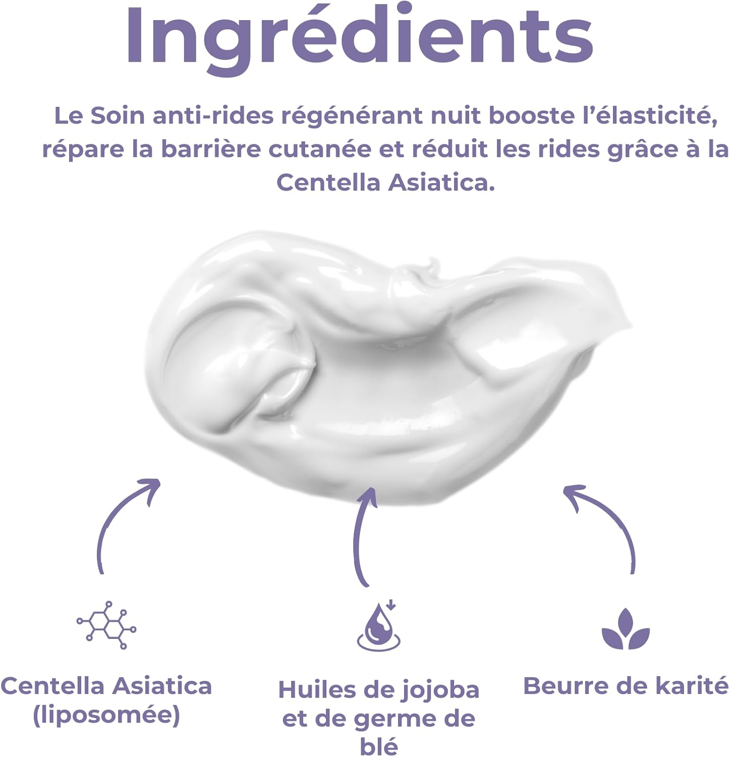 التجاعيد وفقدان الصلابة. فوائد المكونات النشطة: . – سنتيلا اسياتيكا الدهنية: يحافظ على وظائف الألياف الداعمة. – تعمل زبدة الشيا على ترطيب وتجديد دهون البشرة بشكل فعال للمساعدة في استعادة حاجز البشرة والحفاظ عليه. – زيوت الجوجوبا وجنين القمح. يتم تغذية البشرة بشكل مكثف لاستعادة ليونتها ونعومتها. نتائج ملحوظة: ليلة بعد ليلة، يعيد الشعور بالصلابة والراحة لبشرتك التي تبدو منتعشة ومتماسكة. مرطبة، تبدو منتعشة وتستعيد مرونتها وإشراقها بعد نوم هانئ ليلاً. بشرة منعشة ومشرقة. ملمس ناعم وذوب. الحجم: 50 مل. صُنع في فرنسا. تم اختباره من قبل أطباء الجلد.