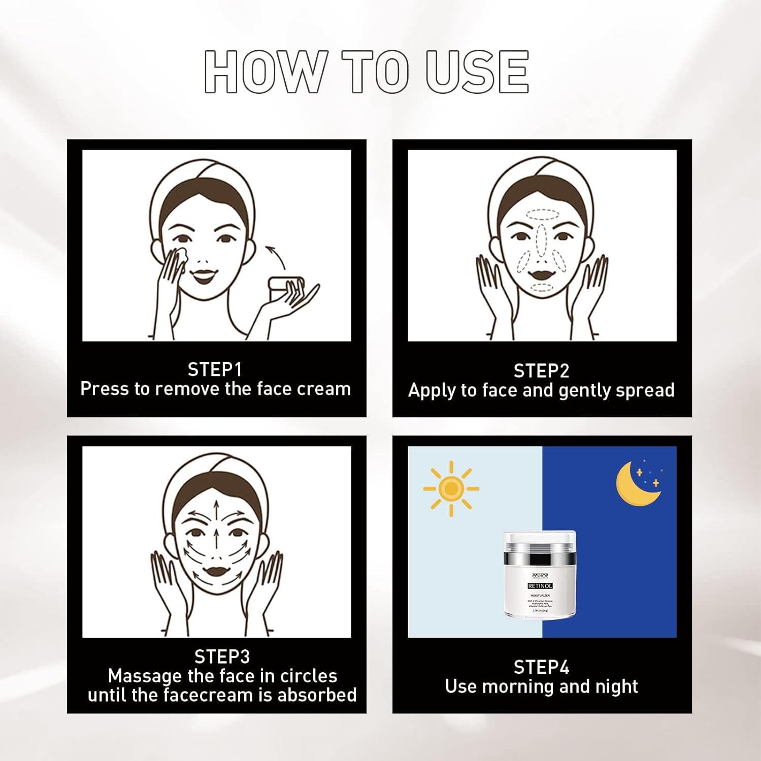 ضعي كمية صغيرة على منطقة الوجه والرقبة النظيفة والجافة قبل النوم. دلكي بلطف بحركات دائرية حتى يتم امتصاصه بالكامل. المكون النشط: Retinol. للاستخدام الخارجي فقط. توقف عن الاستخدام في حالة حدوث تهيج. يُحفظ بعيدًا عن متناول الأطفال.