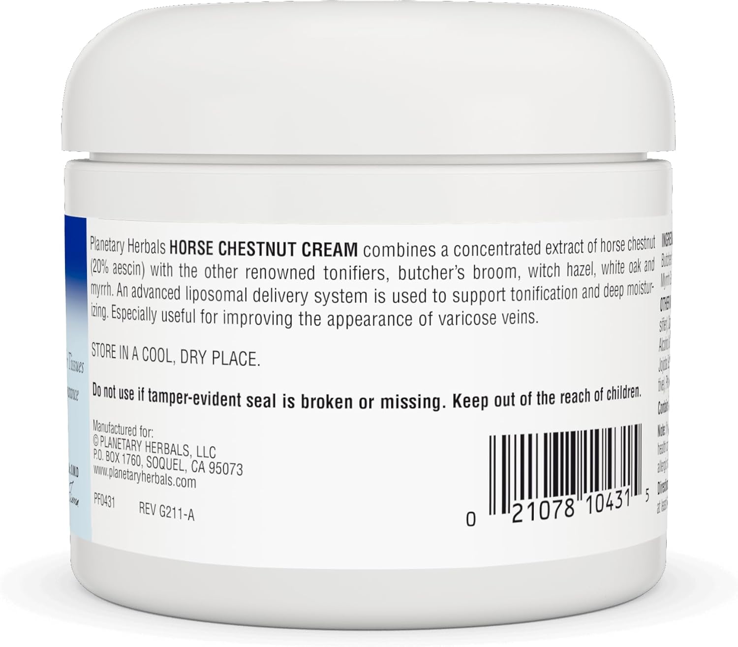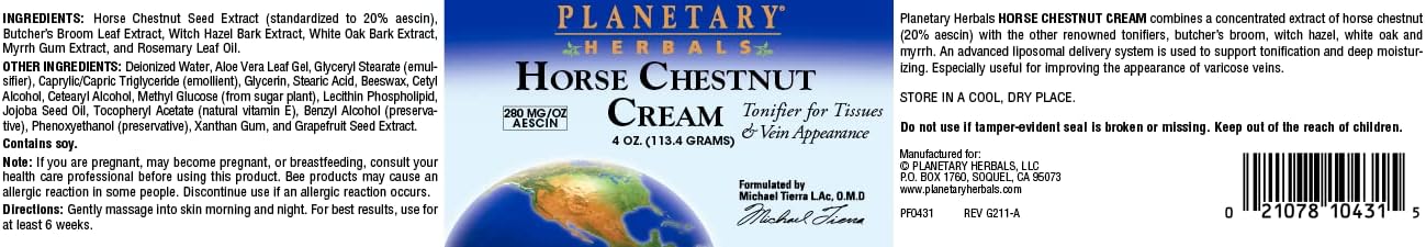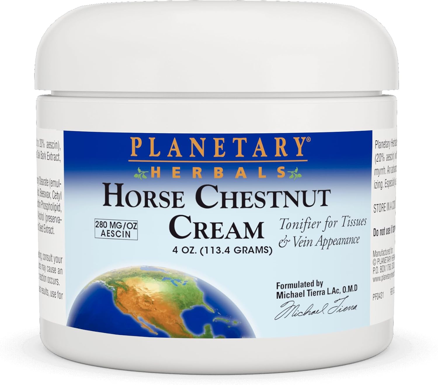 الاعشاب الكوكبية يجمع كريم كستناء الحصان بين مستخلص مركز من كستناء الحصان (20% ايسين) مع مكنسة الجزار الشهيرة الأخرى وبندق الساحرة والبلوط الأبيض والمر.