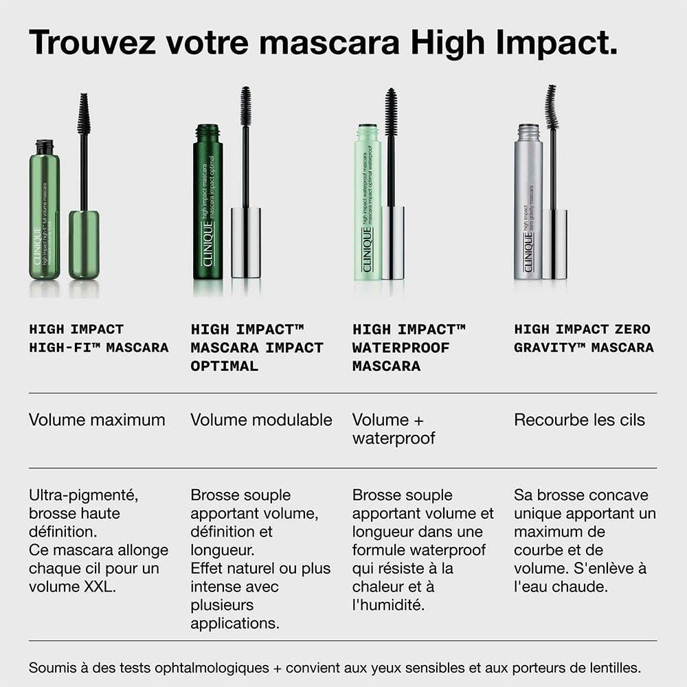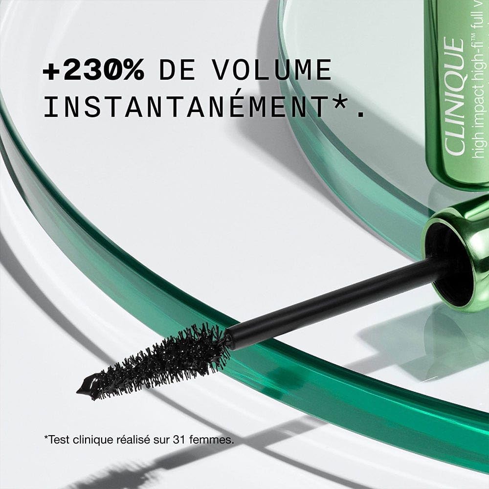 كلينيك ماسكارا هاي امباكت هاي فاي فول فوليوم هي ماسكارا تدوم طويلاً تمنح الرموش كثافة أكبر بمقدار 3 مرات. تركيبة الجل خفيفة الوزن مليئة بالألياف الصغيرة الأبعاد التي تنتشر عبر الرموش مع كل تمريرة رموش للحصول على أقصى كثافة. مزيج من الزيوت المغذية من جوز الهند والأرغان وزيت المورينجا يجعل الرموش أقوى وأكثر نعومة وتبدو أكثر صحة. تغلف الفرشاة المبتكرة كل شعرة وتلتقط حتى الرموش القصيرة والرفيعة، مما يمنحها أقصى كثافة من الجذور إلى الأطراف.