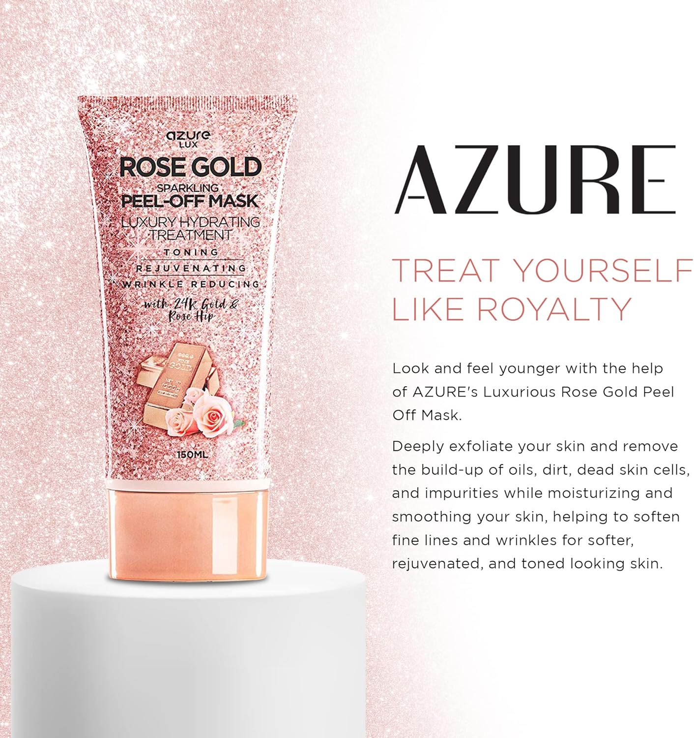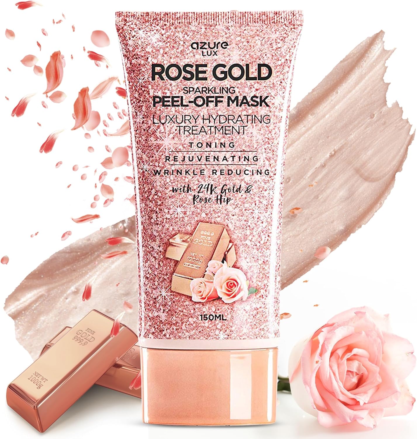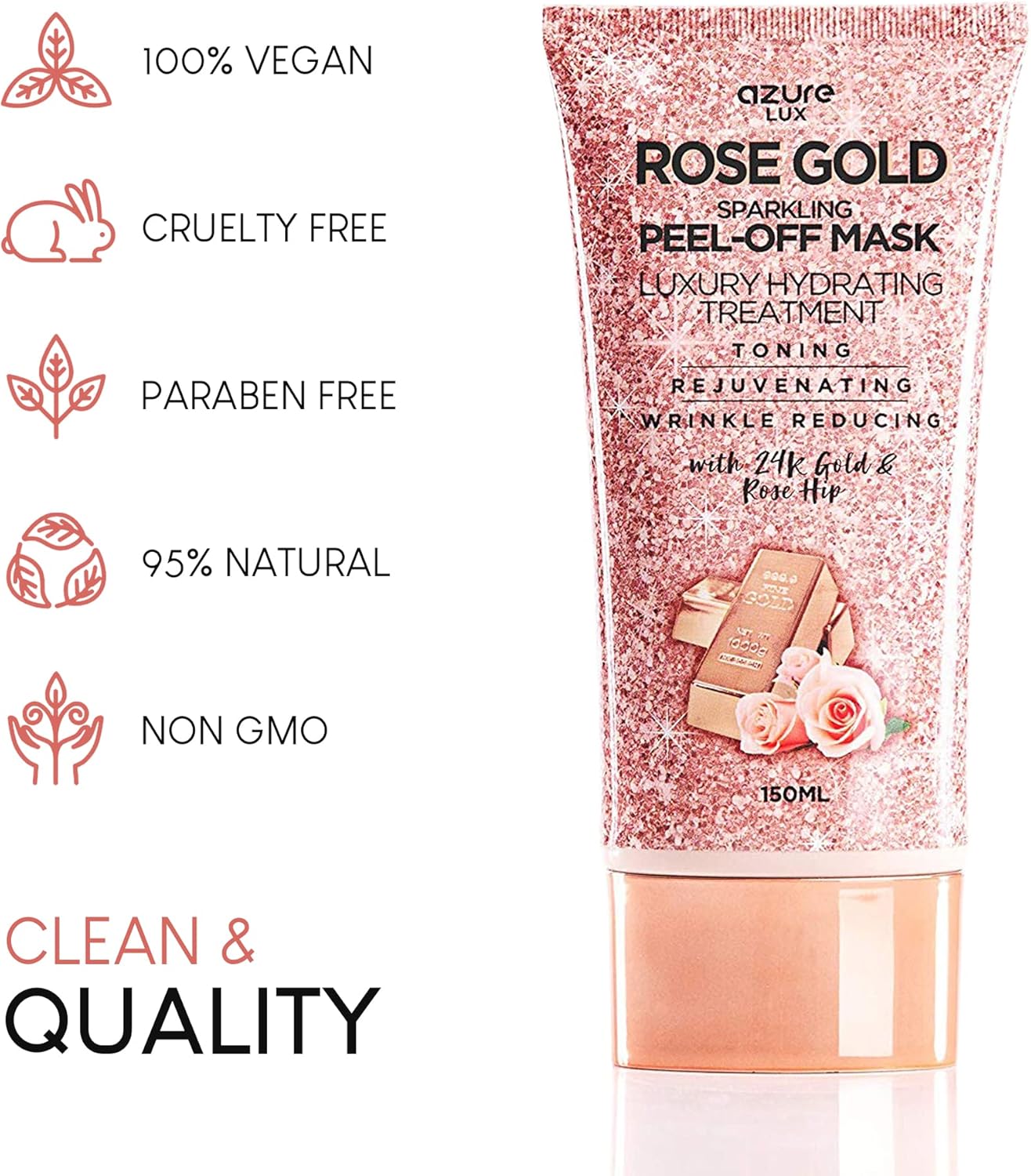 قناع الوجه الفاخر باللون الذهبي الوردي يحتوي على مزيج يساعد على استعادة إشراقة مشرقة وشبابية لبشرتك. يعمل قناع الوجه المرطب الخاص بنا بفعالية كمزيل للرؤوس السوداء الذي يسحب الزيت والأوساخ وخلايا الجلد الميتة والشوائب، مما يمنحك بشرة مشرقة ومتوهجة.