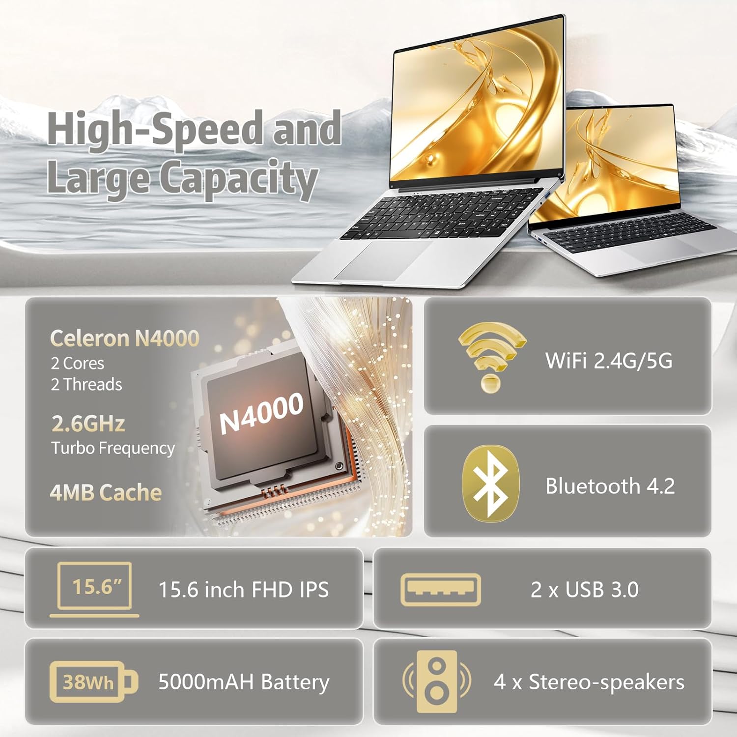【المعالج وبطاقة الرسومات】يستخدم هذا الكمبيوتر معالج سيليرون N4000 بتردد أقصى يصل إلى 2.6 جيجاهرتز ومجهز ببطاقة رسومات UHD 600، والتي تعمل بتردد يصل إلى 750 ميجاهرتز، مع أداء أسرع واستجابة أكبر، والتي يمكنها بسهولة التعامل مع المهام اليومية والتعلم والترفيه. بالإضافة إلى ذلك، يتم تثبيته مسبقًا بأحدث نظام ويندوز 11 برو، مما يضمن تعدد المهام بشكل أسرع وتشغيل سلس.