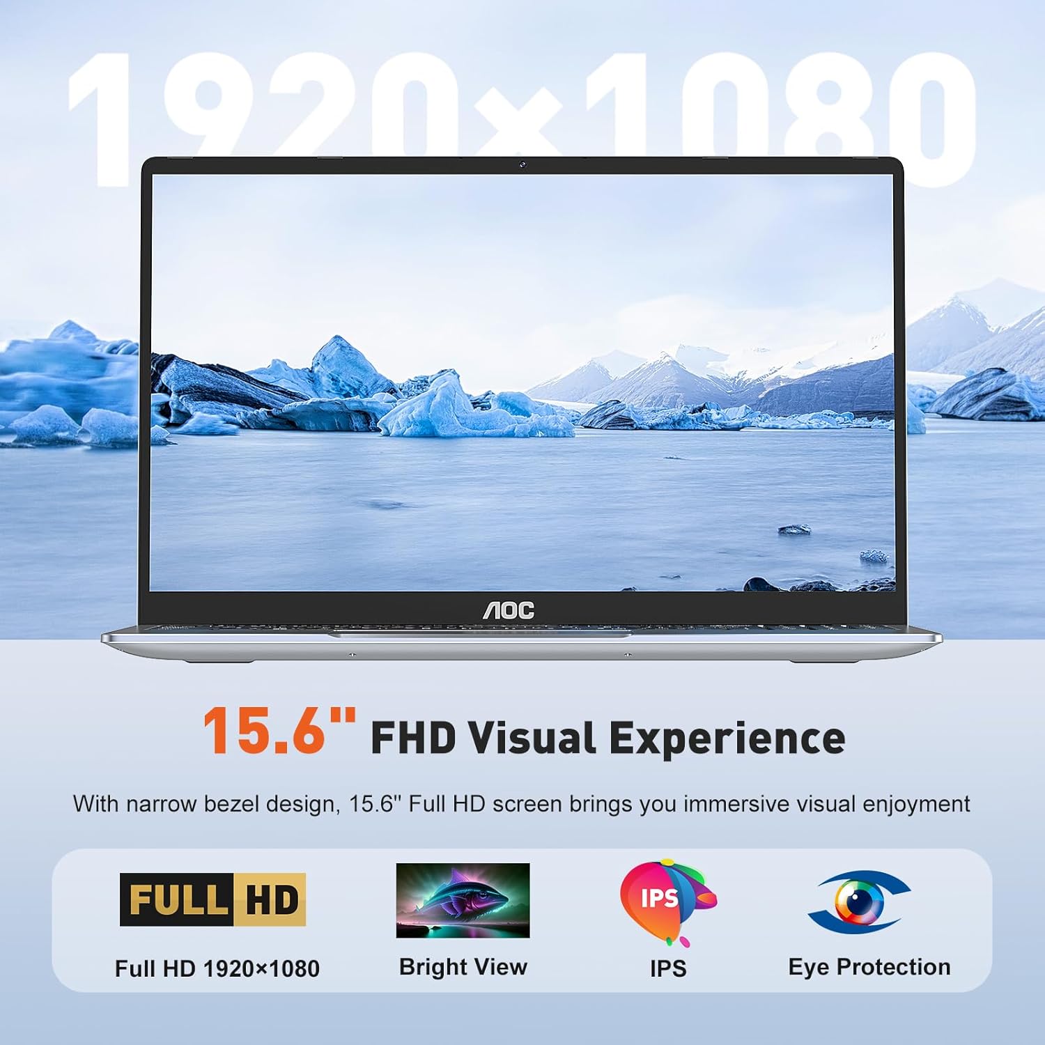 AOC احدث لابتوب بمعالج N97 (حتى 3.6GHz) بشاشة FHD IPS مقاس 15.6 انش وذاكرة RAM 16GB وSSD 512GB وويندوز 11 خفيف ورفيع وهيكل معدني وكاميرا ويب ومنفذ نوع C وUSB 3.2