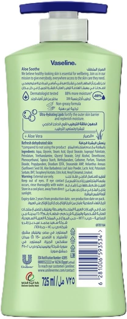 تمزج تركيبة لوشن الجسم الملطف للعناية المكثفة بخلاصة الصبار من فازلين بين خلاصة الصبار النقي و3 مرطبات متعددة الطبقات لترطب بعمق وتترك لبشرتك شعورًا صحيًا ومنتعشًا وناعمًا. يحتوي على مستخلص الصبار النقي، المعروف بأنه يساعد على إنعاش البشرة وتهدئتها، ويتم امتصاصه بسرعة للحصول على ملمس غير دهني.