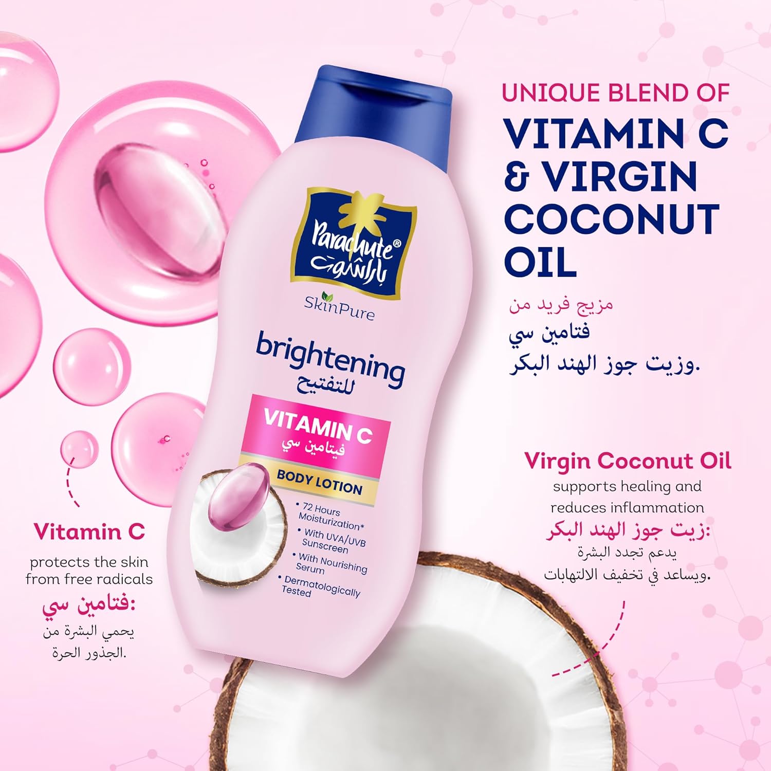 أفضل ما يقدمه العلم والطبيعة: قوة فيتامين سي وزيت جوز الهند البكر في مزيج واحد: لبشرة أكثر إشراقًا وتغذية عميقة.