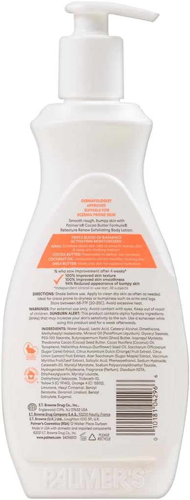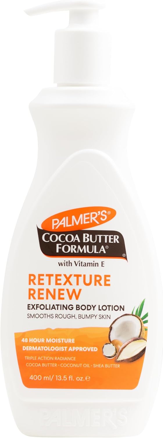 قم بتنعيم وتنعيم البشرة الخشنة والوعرة باستخدام لوشن بالمرز Cocoa Butter Reexure & Renew Exfoliating Body Lotion، المصنوع من AHAs ومزيج ثلاثي من المرطبات المنشطة للتألق زبدة الكاكاو وزيت جوز الهند وزبدة الشيا لتقشير خلايا الجلد الميتة وتنعيم البشرة الوعرة.