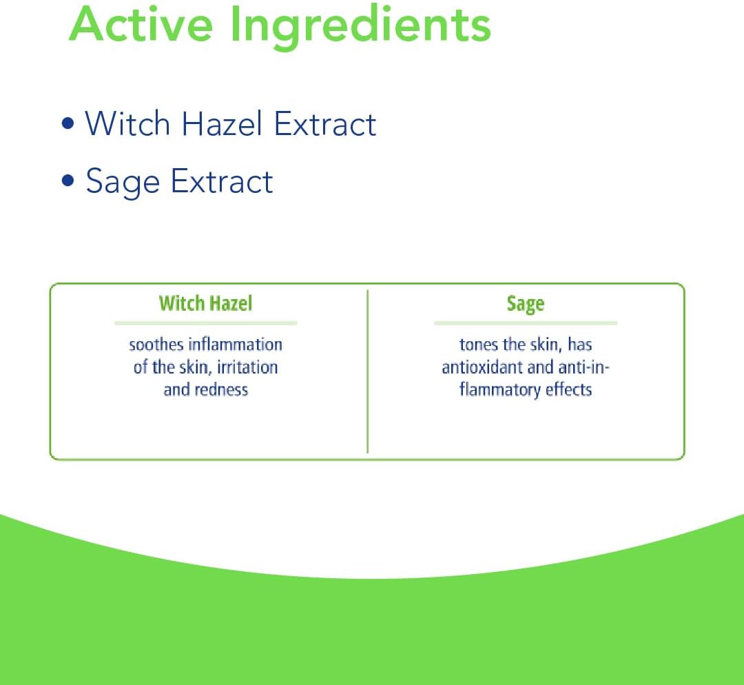 يتميز مستخلص بندق الساحرة الفعال بتأثير مضاد للالتهابات، وبفضل محتواه من التانين، يجدد البشرة ويكون له تأثير قابض. مستخلص المريمية له تأثير مضاد للجراثيم ومضاد للالتهابات. يحسن ويحافظ على حالة البشرة الجيدة. مكونات نشطة • مستخلص بندق الساحرة • مستخلص المريمية. الدراسات: تم تأكيد فعالية المنتجات من خلال اختبارات الاستخدام التي أجريت على الأشخاص ذوي البشرة المختلطة والدهنية والمعرضة لحب الشباب. أكد 96.6% من مقدمي الطلبات أن المنتج ينظف البشرة. أكد 96.6% من مقدمي الطلبات أن المنتج يزيل المكياج والشوائب بلطف من سطح البشرة، مما يترك شعورًا بالانتعاش. أكد 89.7% من مقدمي الطلبات أن المنتج يعمل على تطبيع البشرة ويجعلها غير لامعة. أكد 89.7% من مقدمي الطلبات أن المنتج يترك البشرة نظيفة وغير لامعة. تم اختباره من قبل أطباء الجلد.