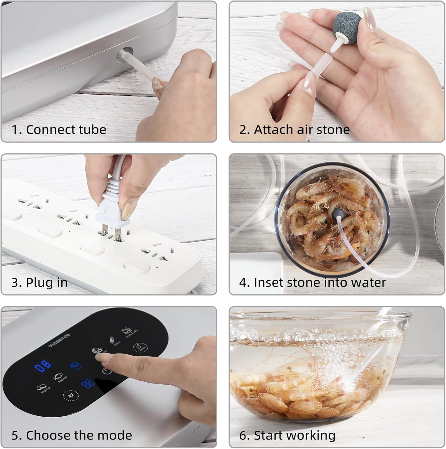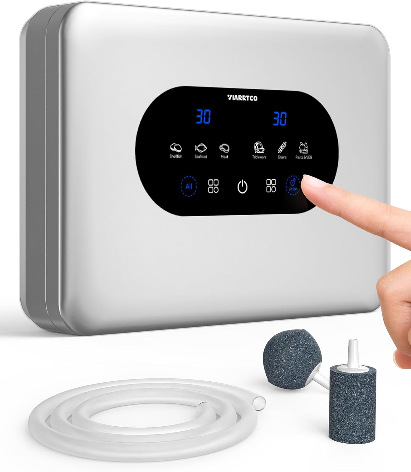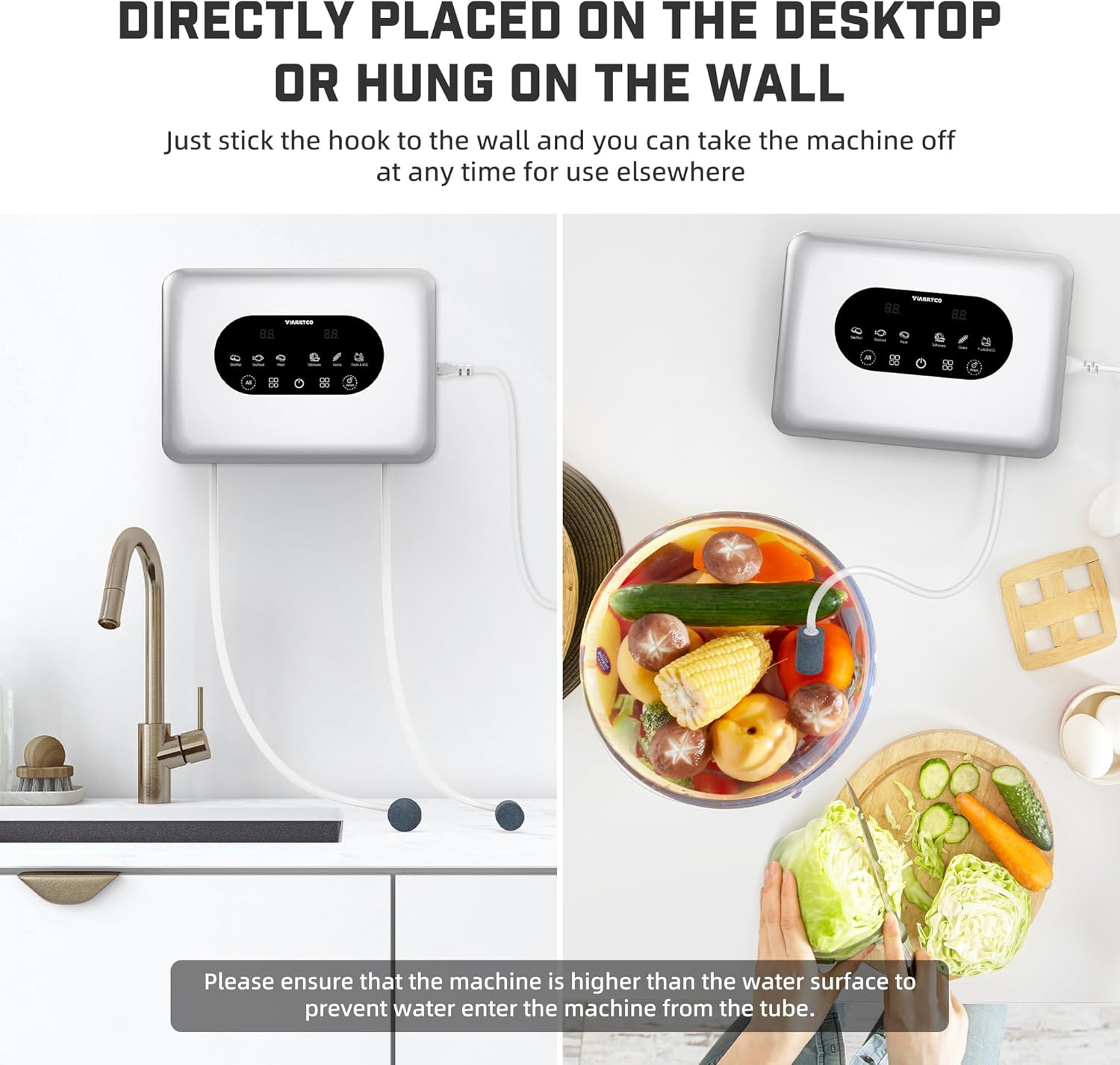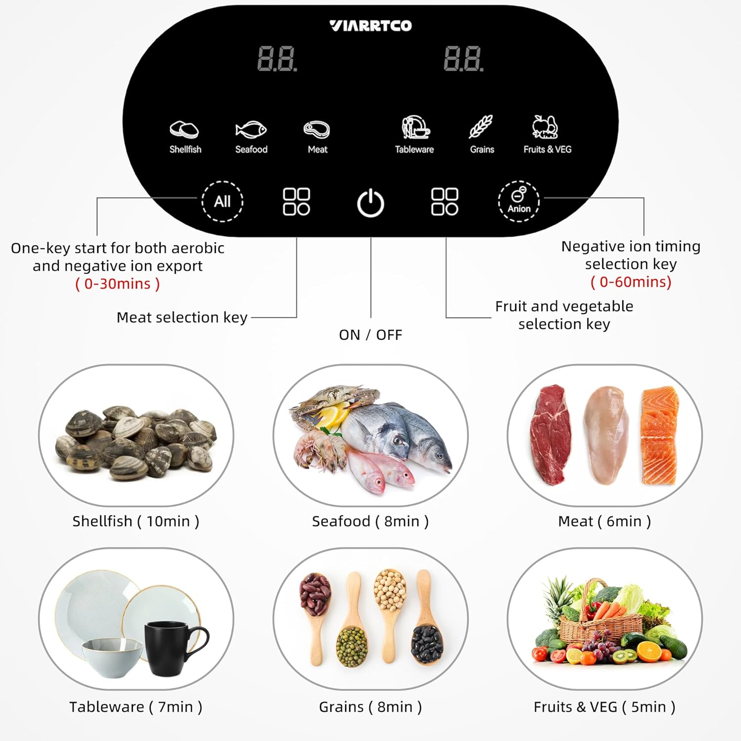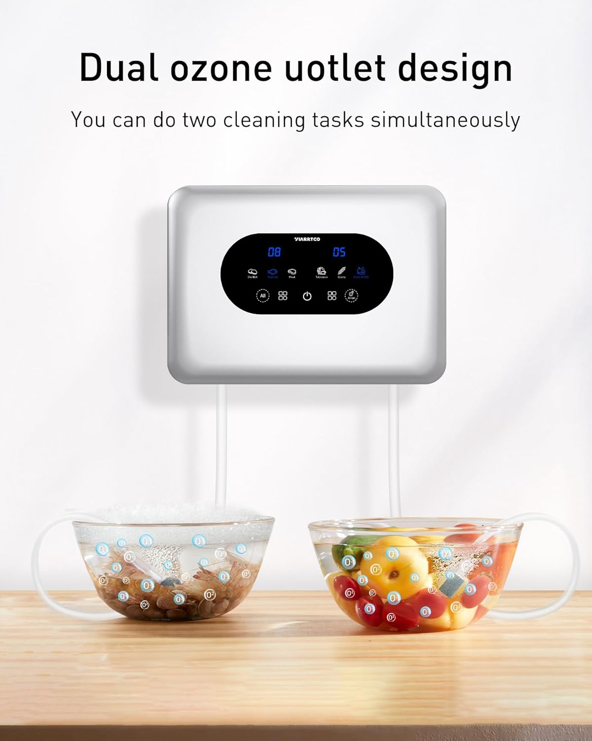 تصميم مخرج الأوزون المزدوج: يتم إطلاق الأوزون بالتساوي من المنفذين بمعدل 600 ملغ/ساعة، فقط قم بتوصيل الأنابيب وأحجار موزع الهواء، ويمكنك تنظيف اللحوم والخضروات في نفس الوقت.