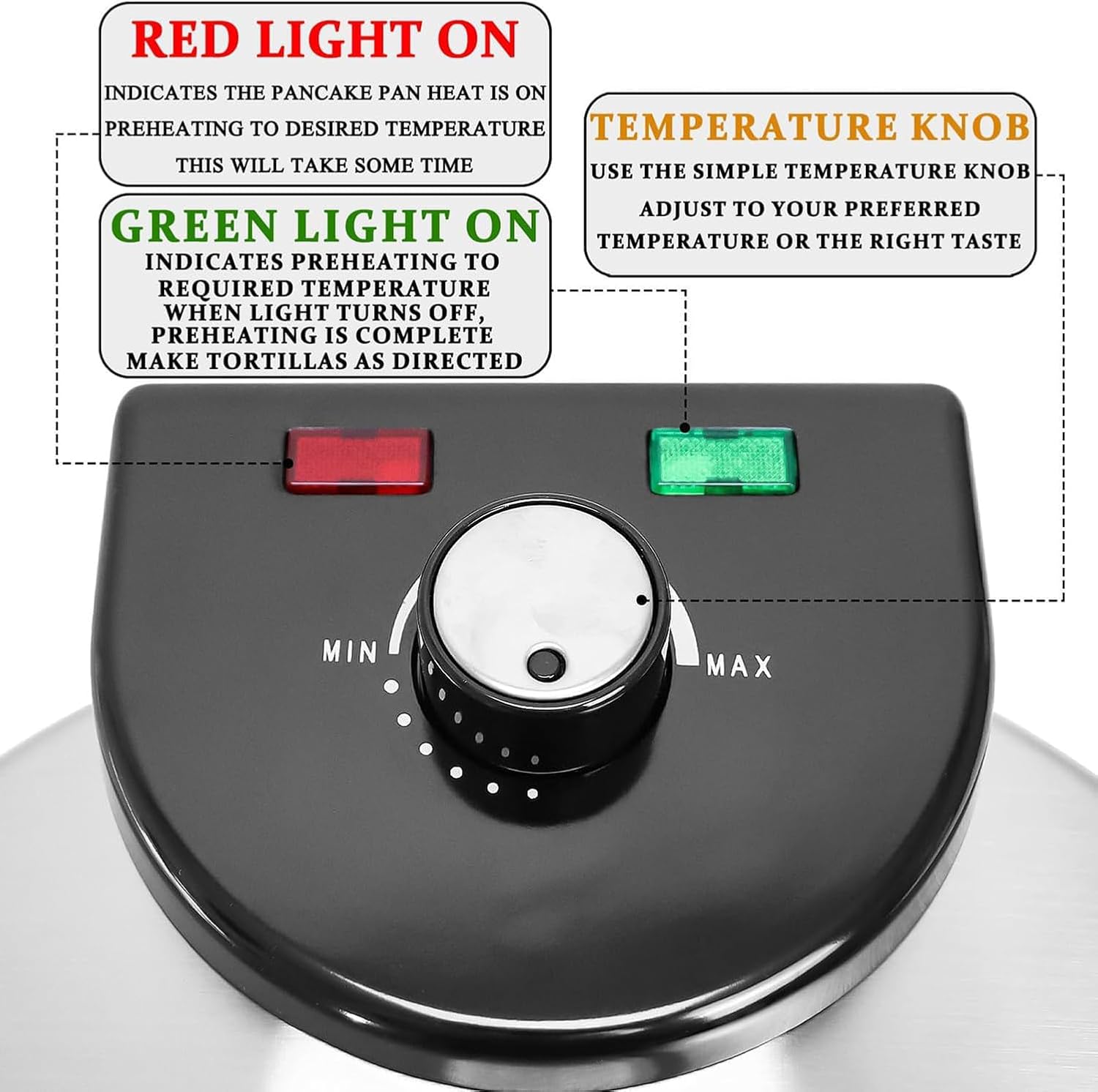 【كفاءة عالية للطاقة】مع عنصر تسخين 1800 واط، تضمن ماكينة صنع الروتي هذه طهيًا سريعًا ومتساويًا. تحكم في درجة الحرارة قابل للتعديل حتى 260 درجة مئوية وإشارة مؤشر LED مدمجة عندما يكون جاهزًا للطهي وعندما ينضج طعامك بشكل مثالي